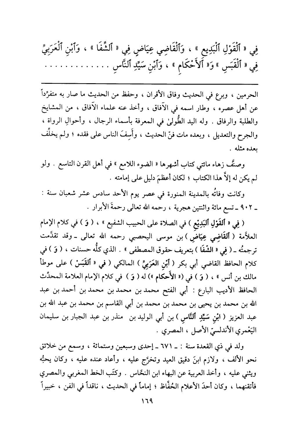 (في «القول البديع) في الصلاة على الحبيب الشفيع» ، (و) في كلام الإمام العلّامة (القاضي عياض) بن موسى اليحصبي رحمه الله تعالى- وقد تقدّمت ترجمته- (في «الشّفا) بتعريف حقوق المصطفى» . الذي كلّه حسنات، (و) في كلام الحافظ القاضي أبي بكر (ابن العربيّ) المالكي (في «القبس) على موطأ مالك بن أنس» ، (و) في ( «الأحكام» ) له (و) في كلام الإمام العلامة المحدّث الحافظ الأديب البارع: أبي الفتح محمد بن محمد بن محمد بن أحمد بن عبد الله بن محمد بن يحيى بن محمد بن محمد بن أبي القاسم بن محمد بن عبد الله بن عبد العزيز (ابن سيّد النّاس) بن أبي الوليد بن منذر بن عبد الجبار بن سليمان اليعمري الأندلسيّ الأصل، المصري.
