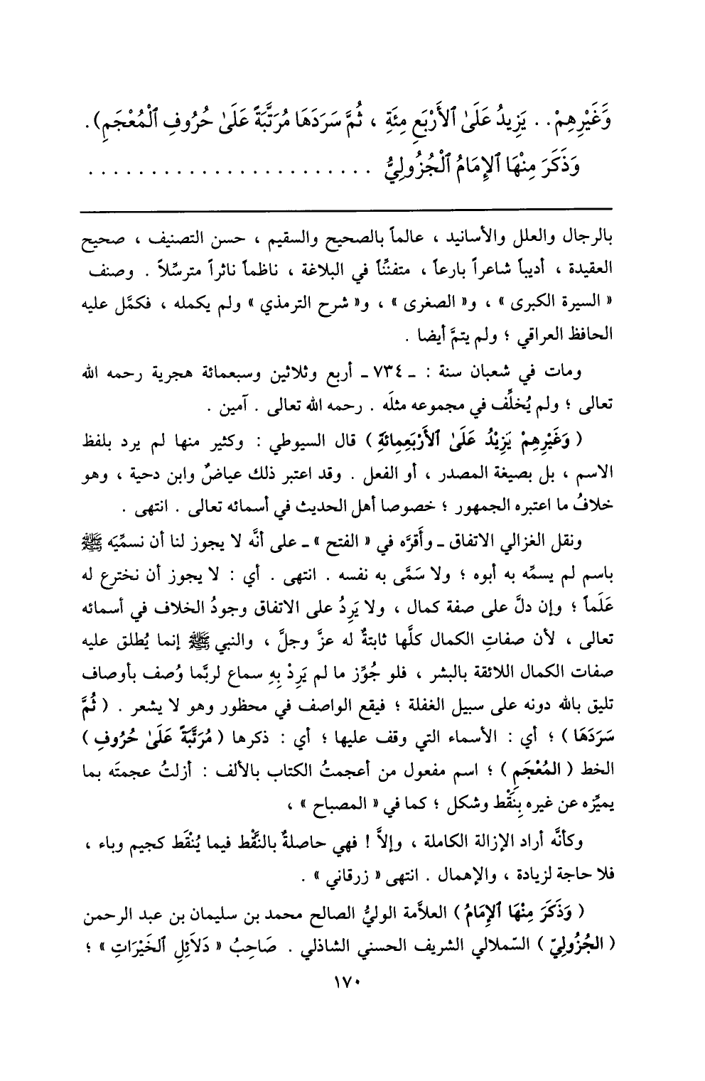 (وذكر منها الإمام) العلّامة الوليّ الصالح محمد بن سليمان بن عبد الرحمن (الجزوليّ) السّملالي الشريف الحسني الشاذلي. صاحب «دلائل الخيرات» ؛