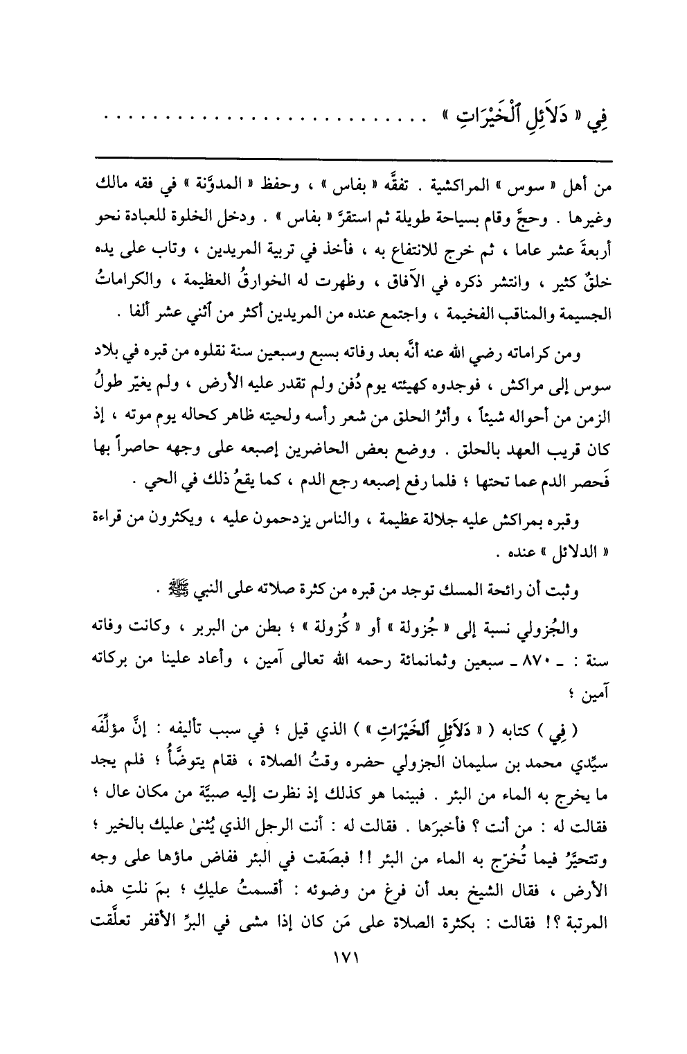 (في) كتابه ( «دلائل الخيرات» ) الذي قيل؛ في سبب تأليفه: إنّ مؤلّفه سيّدي محمد بن سليمان الجزولي حضره وقت الصلاة، فقام يتوضّأ؛ فلم يجد ما يخرج به الماء من البئر. فبينما هو كذلك إذ نظرت إليه صبيّة من مكان عال؛ فقالت له: من أنت؟ فأخبرها. فقالت له: أنت الرجل الذي يثنى عليك بالخير؛ وتتحيّر فيما تخرّج به الماء من البئر!! فبصقت في البئر ففاض ماؤها على وجه الأرض، فقال الشيخ بعد أن فرغ من وضوئه: أقسمت عليك؛ بم نلت هذه المرتبة؟! فقالت: بكثرة الصلاة على من كان إذا مشى في البرّ الأقفر تعلّقت
