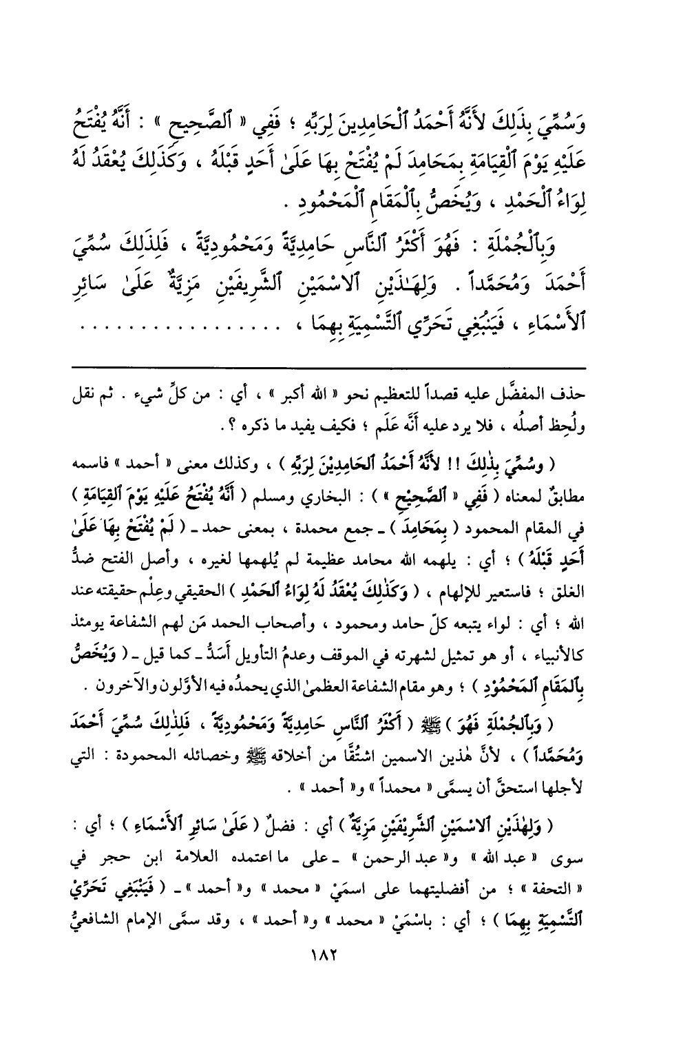 وبالجملة: فهو أكثر النّاس حامديّة ومحموديّة، فلذلك سمّي أحمد ومحمّدا. ولهذين الاسمين الشّريفين مزيّة على سائر الأسماء، فينبغي تحرّي التّسمية بهما، ...