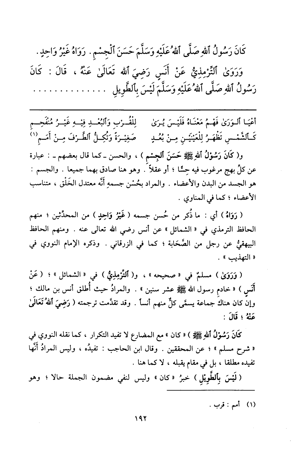 وروى التّرمذيّ عن أنس رضي الله تعالى عنه، قال: كان رسول الله صلّى الله عليه وسلّم ليس بالطّويل ...