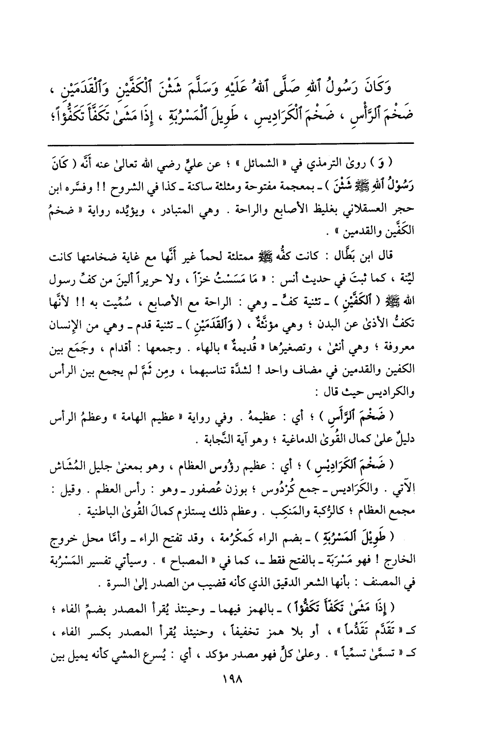 وكان رسول الله صلّى الله عليه وسلّم شثن الكفّين والقدمين، ضخم الرّأس، ضخم الكراديس، طويل المسربة، إذا مشى تكفّأ تكفّؤا؛ (و) روى الترمذي في «الشمائل» ؛ عن عليّ رضي الله تعالى عنه أنّه (كان رسول الله صلّى الله عليه وسلم شثن) - بمعجمة مفتوحة ومثلثة ساكنة- كذا في الشروح!! وفسّره ابن حجر العسقلاني بغليظ الأصابع والراحة. وهي المتبادر، ويؤيّده رواية «ضخم الكفّين والقدمين» .