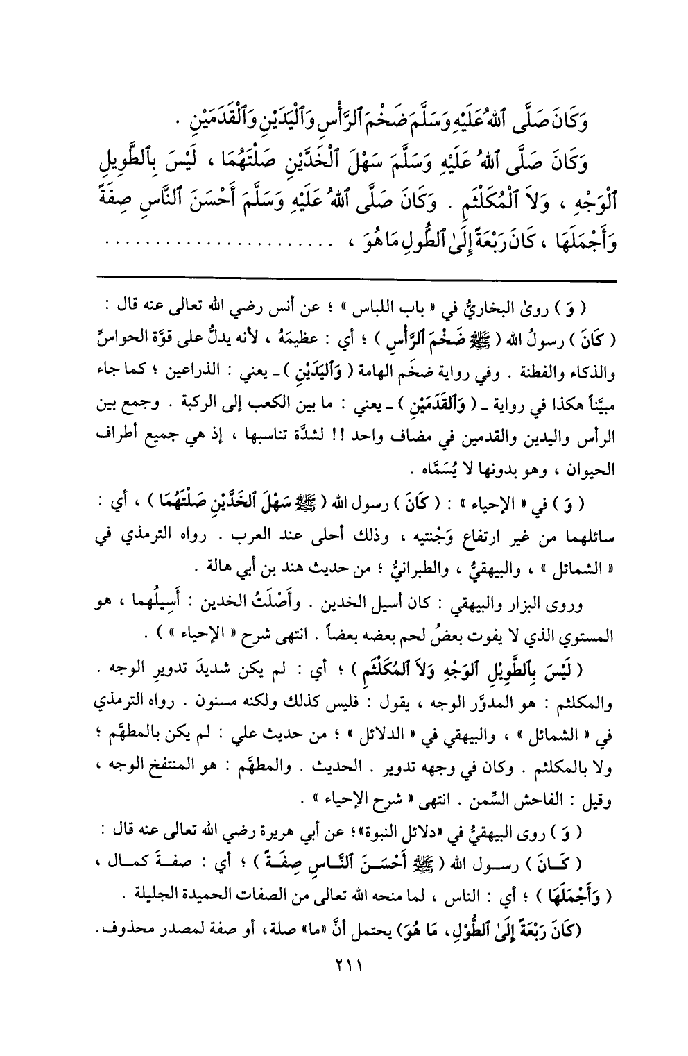وكان صلّى الله عليه وسلّم سهل الخدّين صلتهما، ليس بالطّويل الوجه، ولا المكلثم. وكان صلّى الله عليه وسلّم أحسن النّاس صفة وأجملها، كان ربعة إلى الطّول ما هو، ...