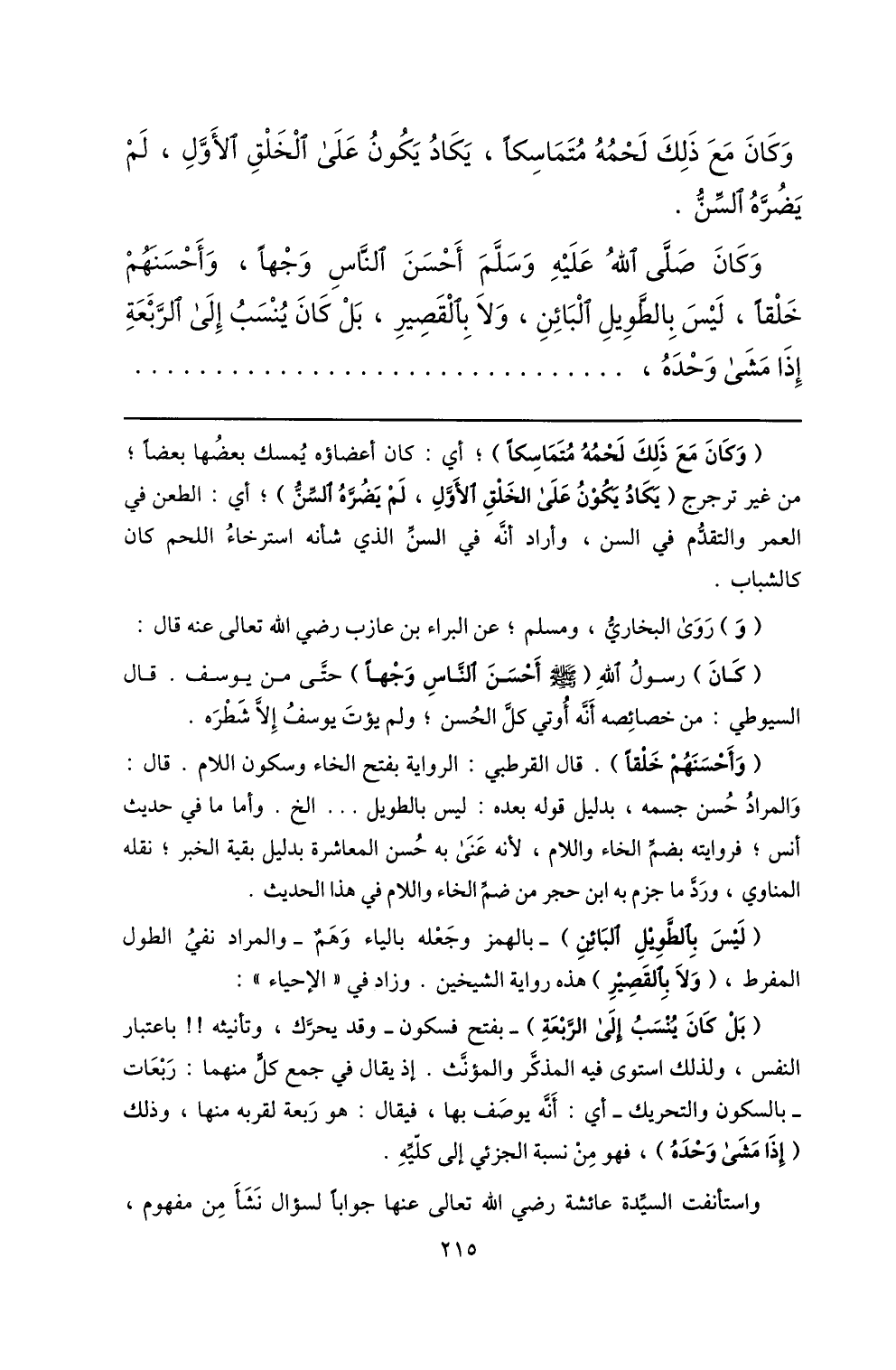 وكان صلّى الله عليه وسلّم أحسن النّاس وجها، وأحسنهم خلقا، ليس بالطّويل البائن، ولا بالقصير، بل كان ينسب إلى الرّبعة إذا مشى وحده، ...