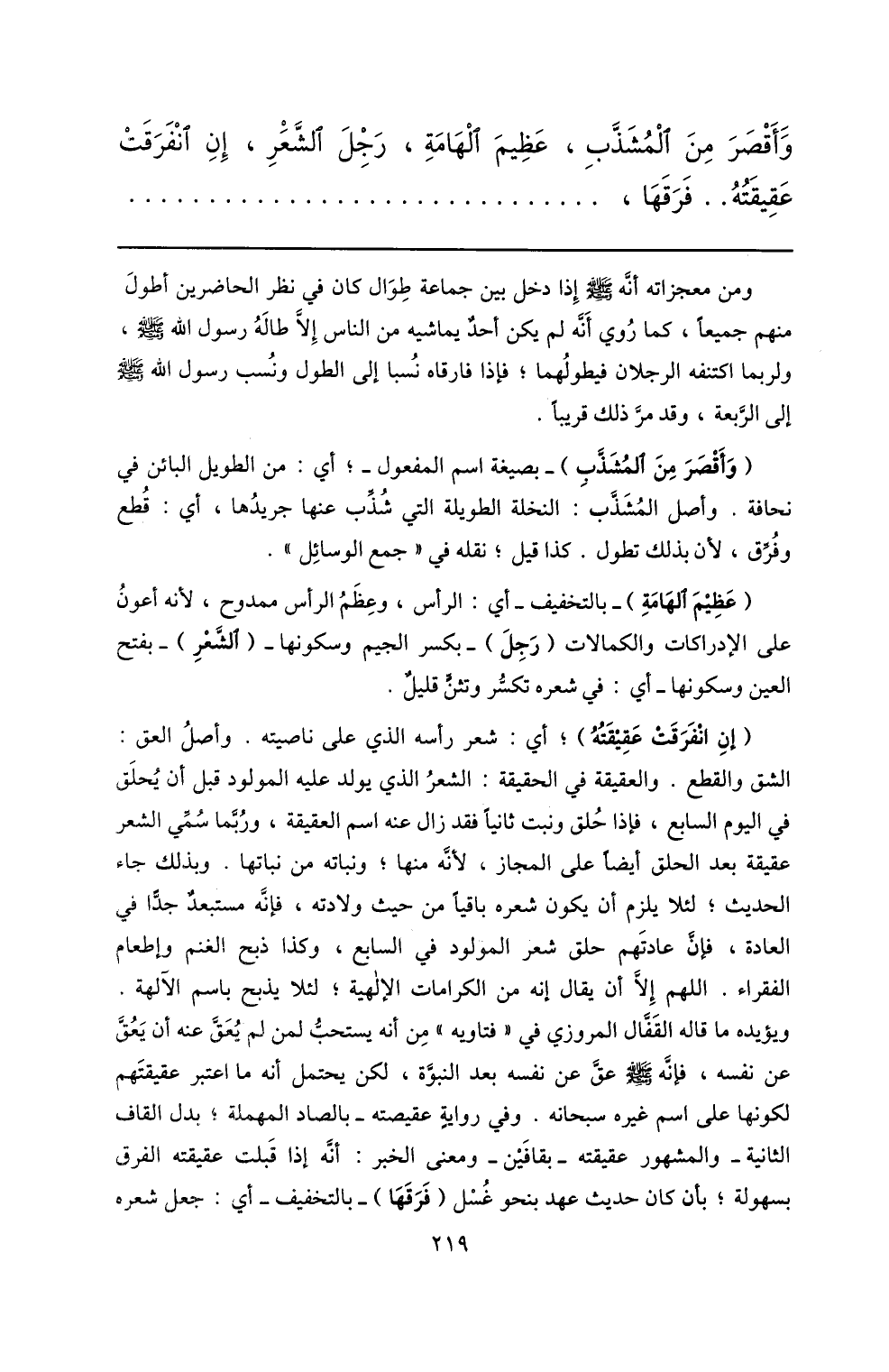 وأقصر من المشذّب، عظيم الهامة، رجل الشّعر، إن انفرقت عقيقته.. فرقها، ...