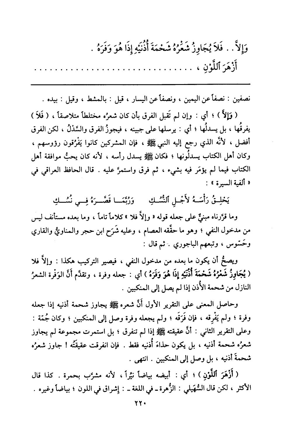وعلى التقرير الثاني: أنّ عقيقته صلّى الله عليه وسلم إذا لم تنفرق؛ بل استمرت مجموعة لم يجاوز شعره شحمة أذنيه، بل يكون حذاء أذنيه فقط. فإن انفرقت عقيقته! جاوز شعره شحمة أذنيه، بل وصل إلى المنكبين. انتهى.
