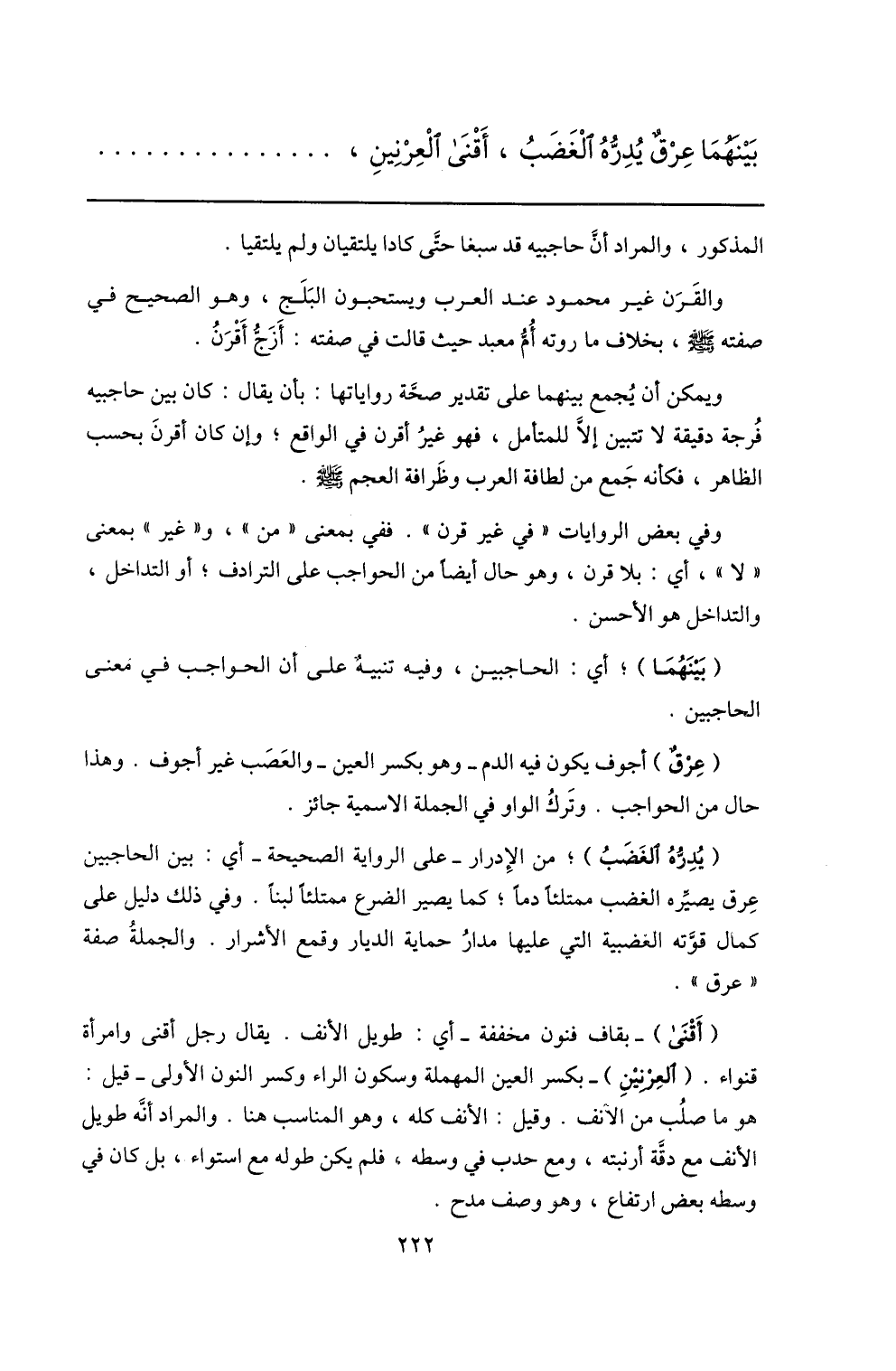 (أقنى) - بقاف فنون مخففة- أي: طويل الأنف. يقال رجل أقنى وامرأة قنواء. (العرنين) - بكسر العين المهملة وسكون الراء وكسر النون الأولى- قيل: