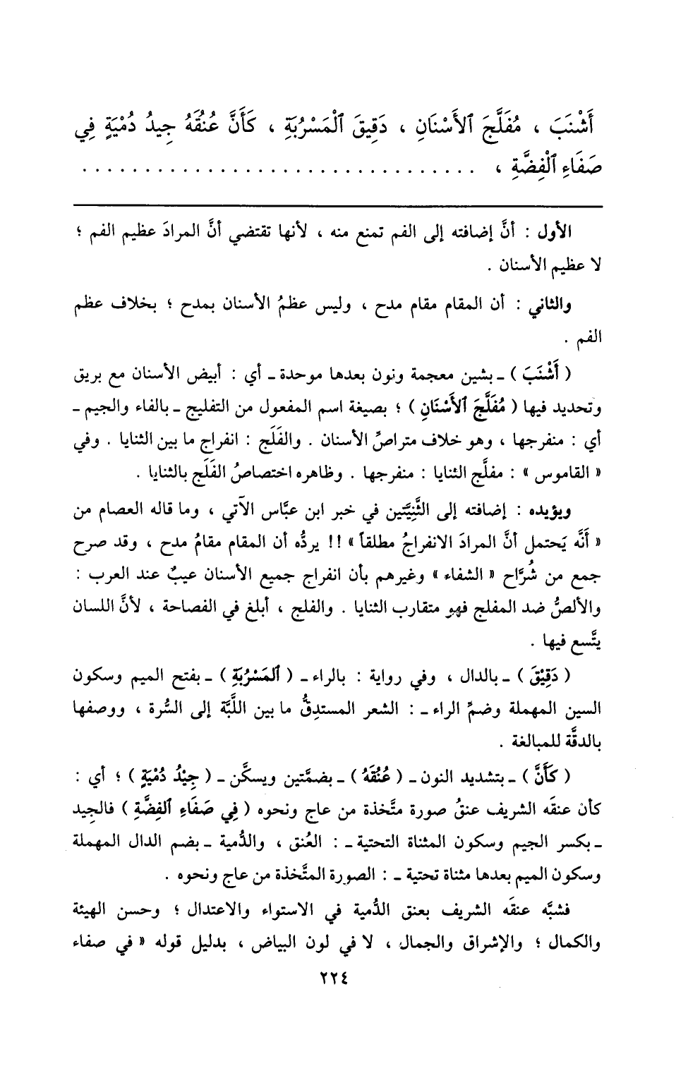 ويؤيده: إضافته إلى الثّنيّتين في خبر ابن عبّاس الآتي، وما قاله العصام من «أنّه يحتمل أنّ المراد الانفراج مطلقا» !! يردّه أن المقام مقام مدح، وقد صرح جمع من شرّاح «الشفاء» وغيرهم بأن انفراج جميع الأسنان عيب عند العرب: