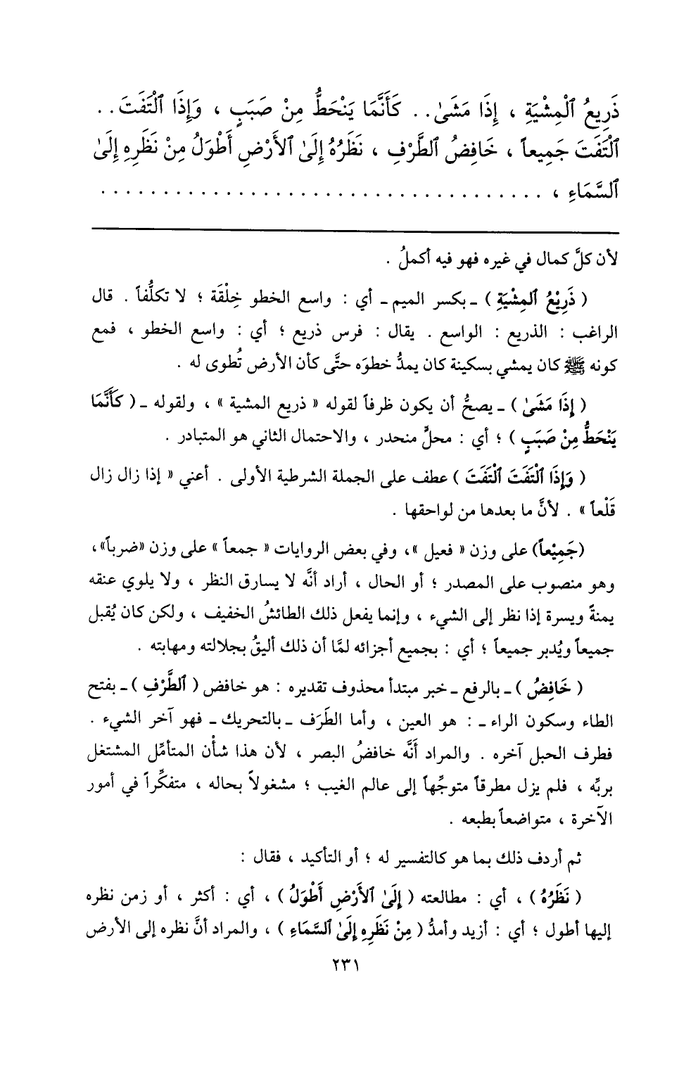 ذريع المشية، إذا مشى.. كأنّما ينحطّ من صبب، وإذا التفت..