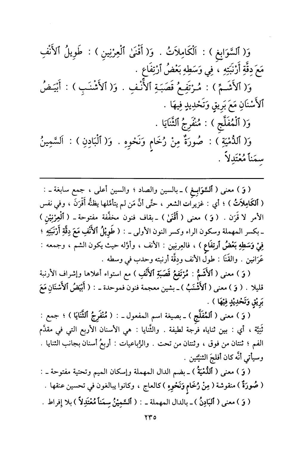 (الكاملات) ؛ أي: غزيرات الشعر، حتّى أنّ من لم يتأمّلها يظنّه أقرن، وفي نفس الأمر لا قرن. (و) معنى (أقنى) - بقاف فنون مخفّفة مفتوحة- (العرنين) بكسر المهملة وسكون الراء وكسر النون الأولى-: (طويل الأنف مع دقّة أرنبته؛ في وسطه بعض ارتفاع) ، فالعرنين: الأنف، وأوّله حيث يكون الشم، وجمعه: