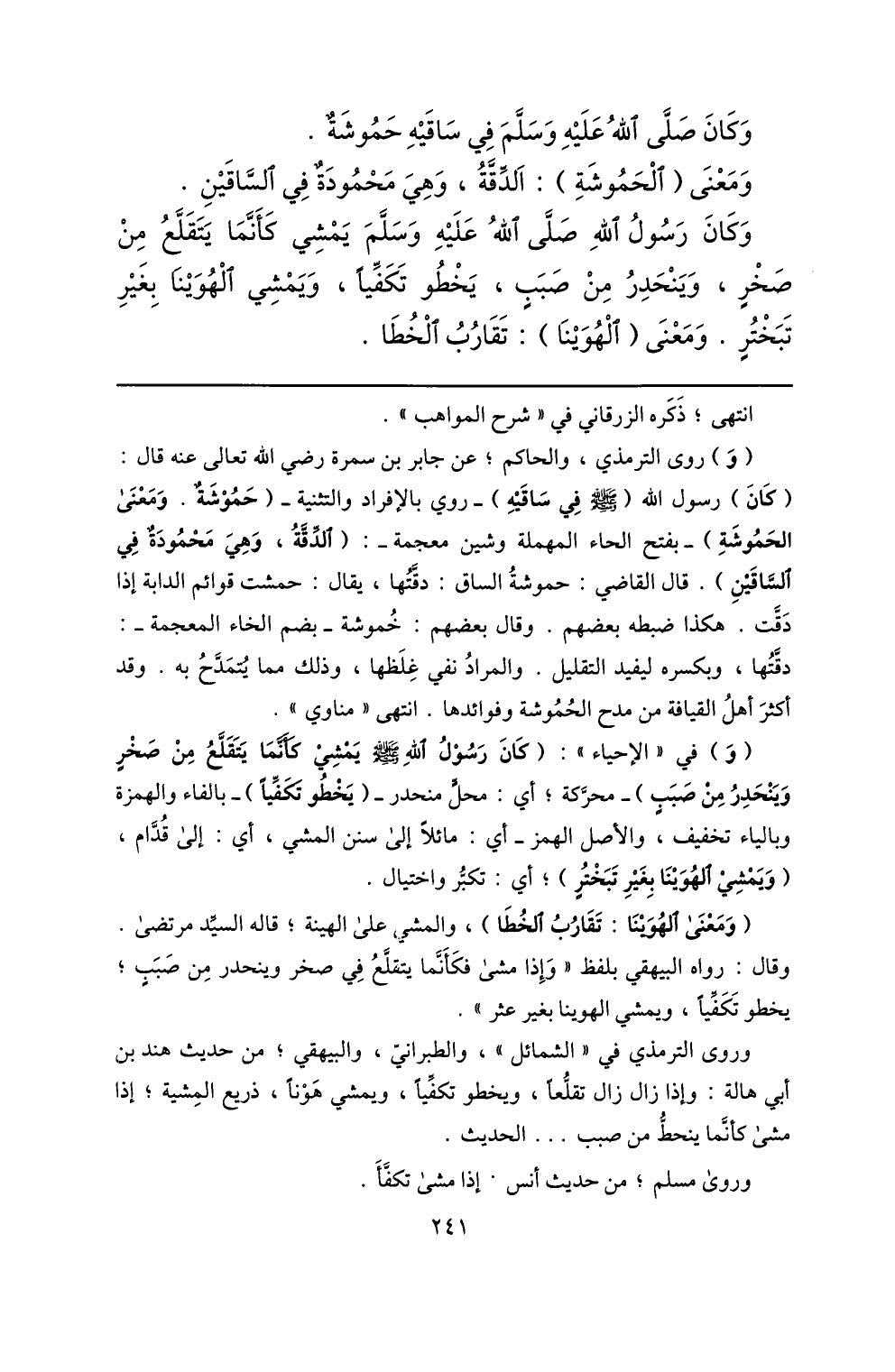 وروى الترمذي في «الشمائل» ، والطبرانيّ، والبيهقي؛ من حديث هند بن أبي هالة: وإذا زال زال تقلّعا، ويخطو تكفّيا، ويمشي هونا، ذريع المشية؛ إذا مشى كأنّما ينحطّ من صبب ... الحديث.