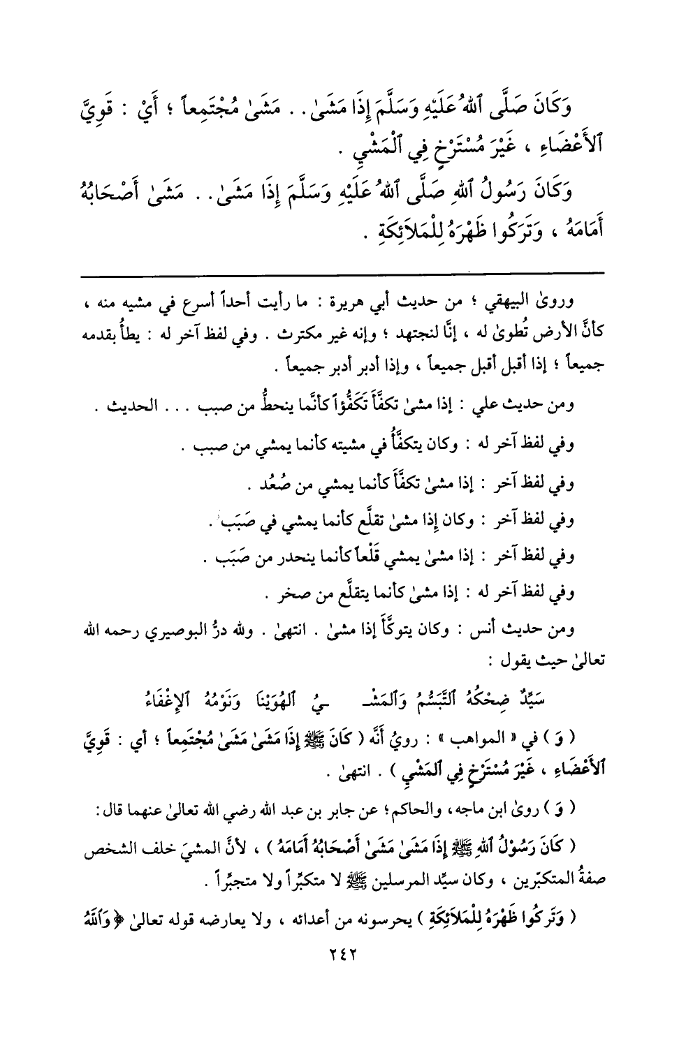 وروى البيهقي؛ من حديث أبي هريرة: ما رأيت أحدا أسرع في مشيه منه، كأنّ الأرض تطوى له، إنّا لنجتهد؛ وإنه غير مكترث. وفي لفظ آخر له: يطأ بقدمه جميعا؛ إذا أقبل أقبل جميعا، وإذا أدبر أدبر جميعا.