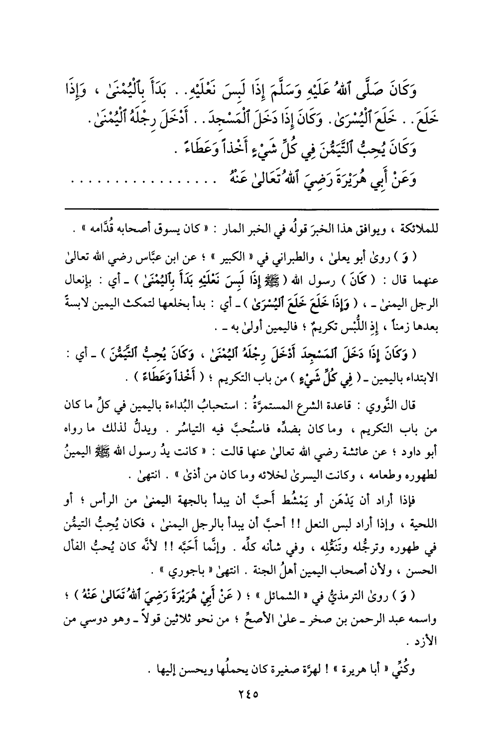 وكان صلّى الله عليه وسلّم إذا لبس نعليه.. بدأ باليمنى، وإذا خلع.. خلع اليسرى. وكان إذا دخل المسجد.. أدخل رجله اليمنى.