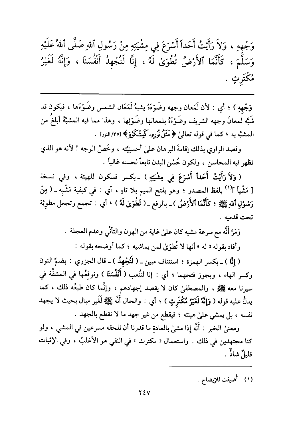 وجهه، ولا رأيت أحدا أسرع في مشيته من رسول الله صلّى الله عليه وسلّم، كأنّما الأرض تطوى له، إنّا لنجهد أنفسنا، وإنّه لغير مكترث.
