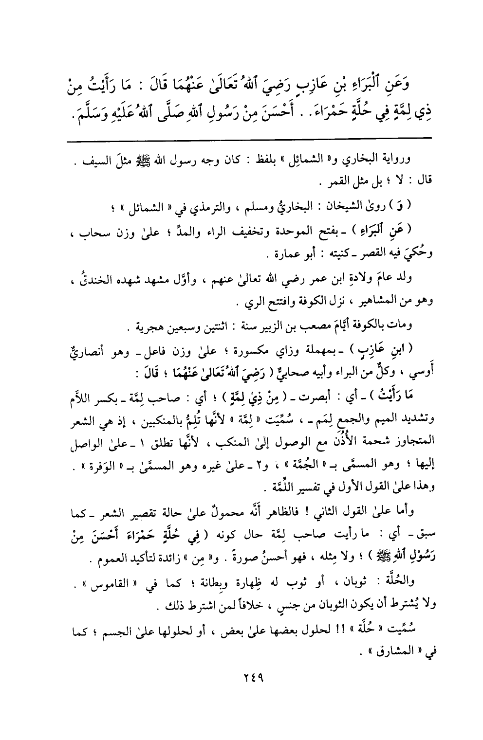 وأما على القول الثاني! فالظاهر أنّه محمول على حالة تقصير الشعر- كما سبق- أي: ما رأيت صاحب لمّة حال كونه (في حلّة حمراء أحسن من رسول الله صلّى الله عليه وسلم) ؛ ولا مثله، فهو أحسن صورة. و «من» زائدة لتأكيد العموم.