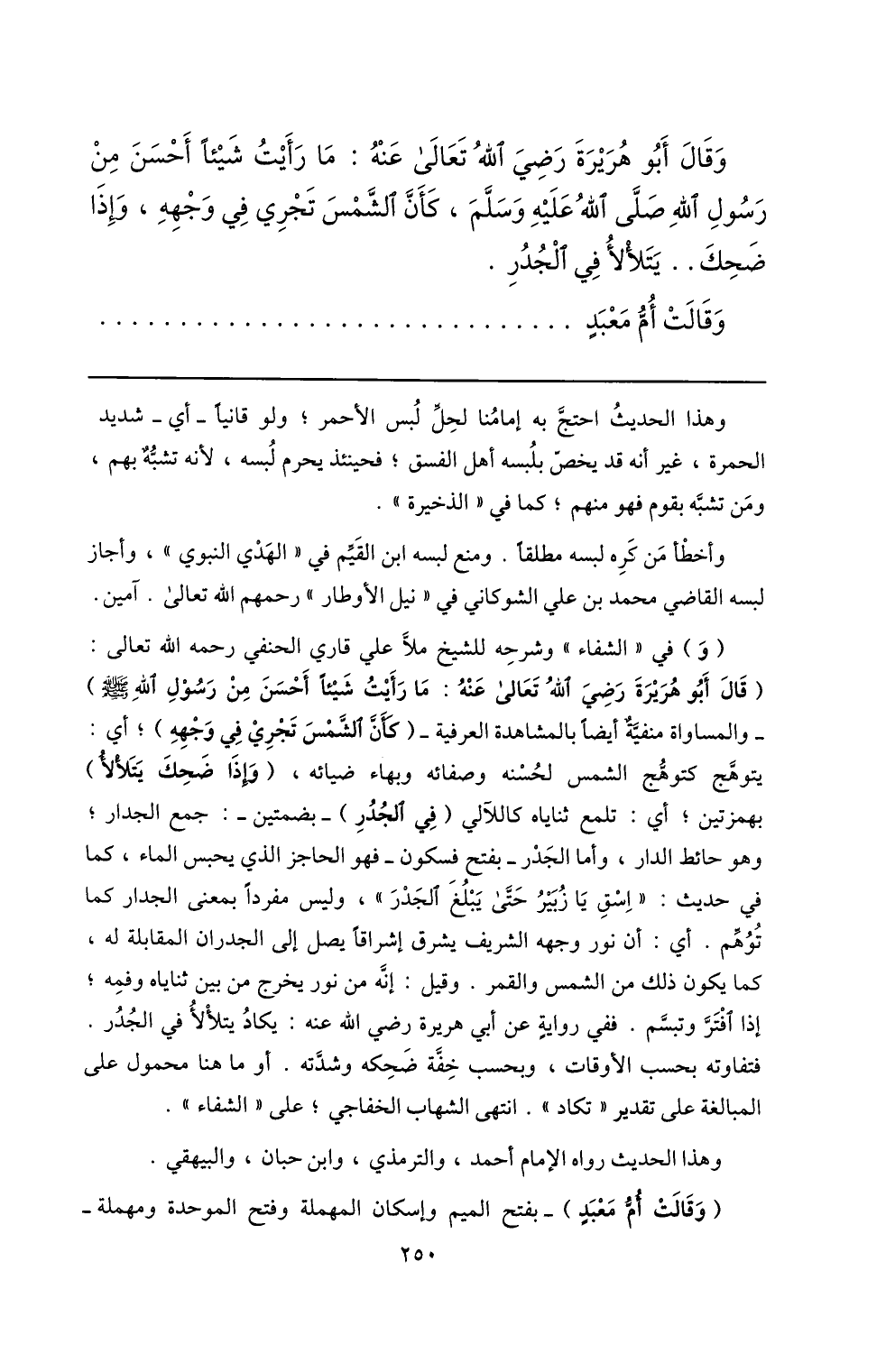 (قال أبو هريرة رضي الله تعالى عنه: ما رأيت شيئا أحسن من رسول الله صلّى الله عليه وسلم) والمساواة منفيّة أيضا بالمشاهدة العرفية- (كأنّ الشّمس تجري في وجهه) ؛ أي: