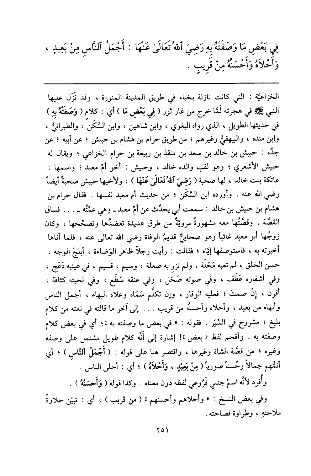 الخزاعيّة: التي كانت نازلة بخباء في طريق المدينة المنورة، وقد نزل عليها النبي صلّى الله عليه وسلم في هجرته لمّا خرج من غار ثور (في بعض ما) أي: كلام (وصفته به) في حديثها الطويل، الذي رواه البغوي، وابن شاهين، وابن السّكن، والطبرانيّ، وابن منده، والبيهقيّ وغيرهم؛ من طريق حرام بن هشام بن حبيش؛ عن أبيه؛ عن جدّه: حبيش بن خالد بن سعد بن منقذ بن ربيعة بن حرام الخزاعي؛ ويقال له حبيش الأشعري؛ وهو لقب والده خالد، وحبيش: أخو أمّ معبد؛ واسمها: