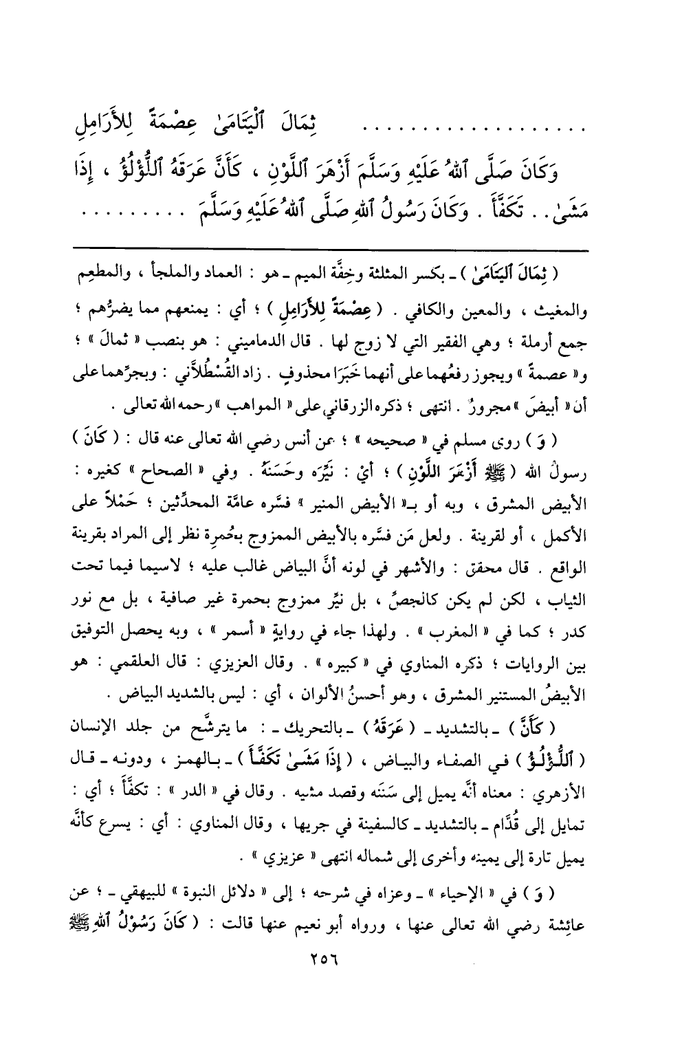 .. ثمال اليتامى عصمة للأرامل وكان صلّى الله عليه وسلّم أزهر اللّون، كأنّ عرقه اللّؤلؤ، إذا مشى.. تكفّأ. وكان رسول الله صلّى الله عليه وسلّم ...