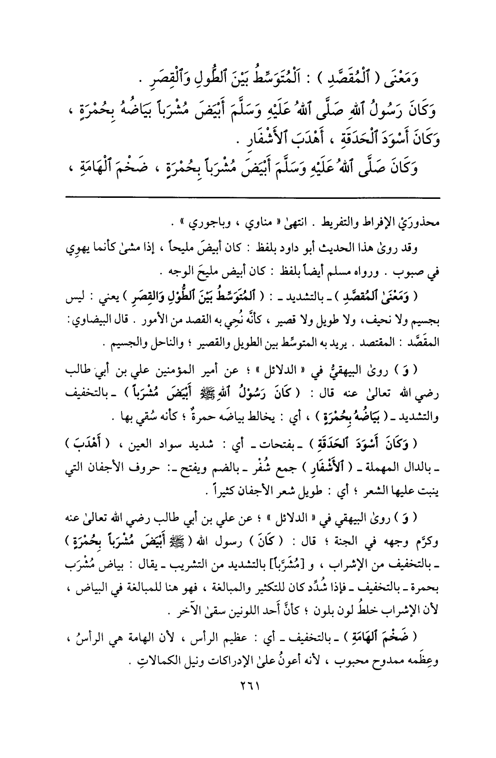 وكان صلّى الله عليه وسلّم أبيض مشربا بحمرة، ضخم الهامة، محذوري الإفراط والتفريط. انتهى «مناوي، وباجوري» .