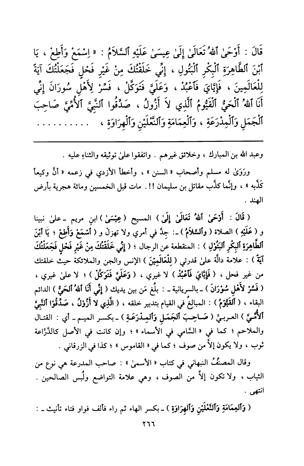 (قال: أوحى الله تعالى إلى) المسيح (عيسى) ابن مريم- على نبينا و (عليه) الصلاة (والسّلام) -: جدّ في أمري ولا تهزل و (اسمع وأطع؛ يا ابن الطّاهرة البكر البتول) : المنقطعة عن الرجال؛ (إنّي خلقتك من غير فحل فجعلتك آية) : علامة دالّة على قدرتي (للعالمين) الإنس والجن والملائكة حيث خلقتك من غير فحل، (فإيّاي فاعبد) لا غيري، (وعليّ فتوكّل) ؛ لا على غيري، (فسّر لأهل سوران) - بالسريانية-: بلّغ من بين يديك (إنّي أنا الله الحيّ) الدائم البقاء، (القيّوم) : المبالغ في القيام بتدبير خلقه، (الّذي لا أزول، صدّقوا النّبيّ الأمّيّ) العربيّ (صاحب الجمل والمدرعة) - بكسر الميم- أي: القتال والملاحم؛ كما في «السّامي في الأسماء» ؛ وإن كانت في الأصل كالدّرّاعة ثوب، ولا يكون إلّا من صوف؛ كما في «القاموس» ؛ كذا في الزرقاني.