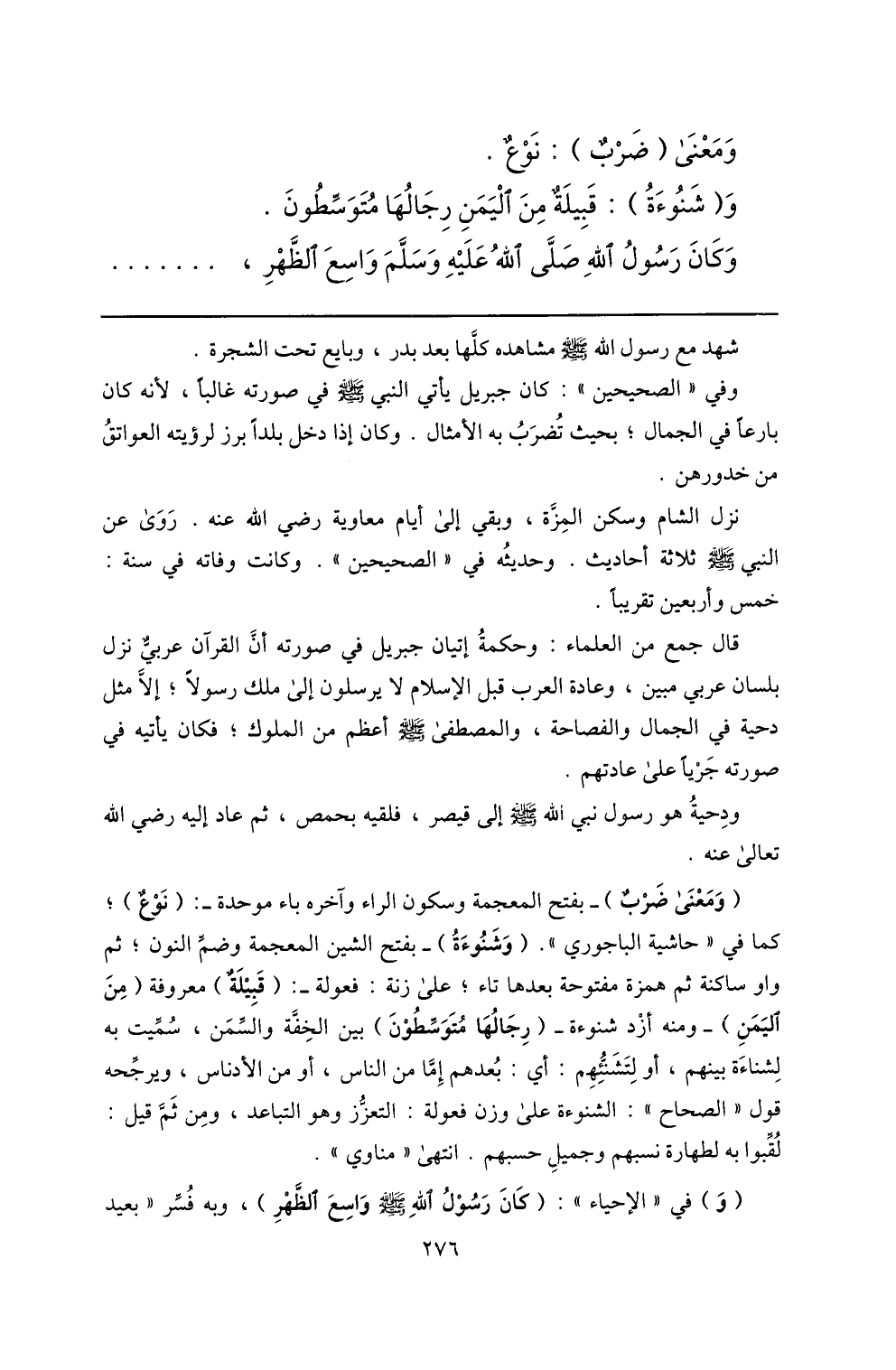 (ومعنى ضرب) - بفتح المعجمة وسكون الراء وآخره باء موحدة-: (نوع) ؛ كما في «حاشية الباجوري» . (وشنوءة) - بفتح الشين المعجمة وضمّ النون؛ ثم واو ساكنة ثم همزة مفتوحة بعدها تاء؛ على زنة: فعولة-: (قبيلة) معروفة (من اليمن) - ومنه أزد شنوءة- (رجالها متوسّطون) بين الخفّة والسّمن، سمّيت به لشناءة بينهم، أو لتشنّئهم: أي: بعدهم إمّا من الناس، أو من الأدناس، ويرجّحه قول «الصحاح» : الشنوءة على وزن فعولة: التعزّز وهو التباعد، ومن ثمّ قيل: