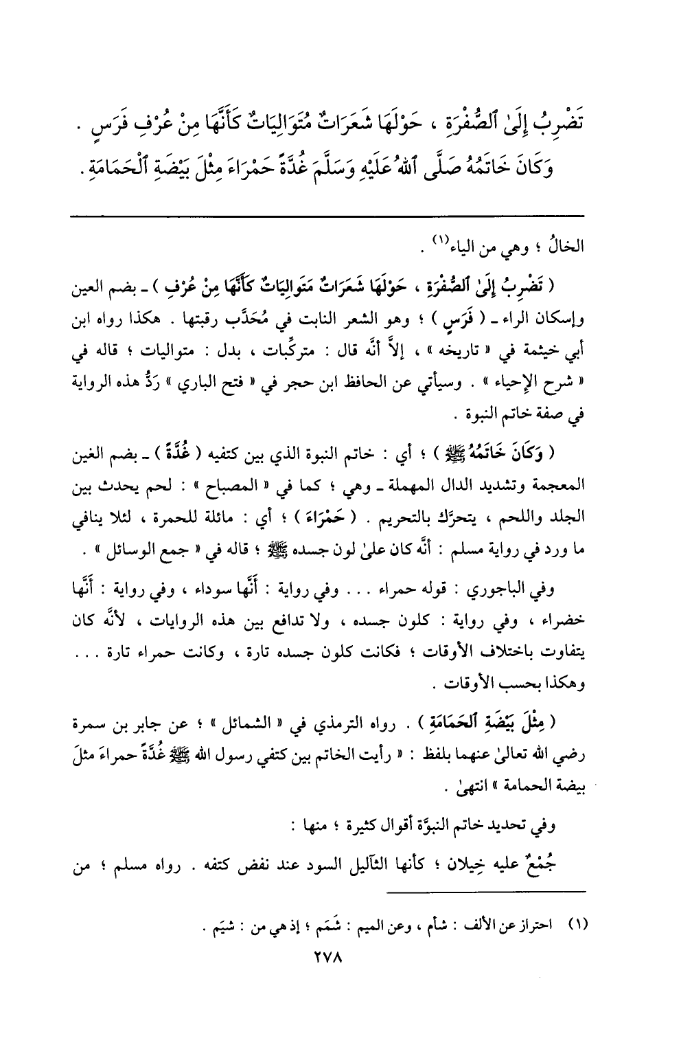 (تضرب إلى الصّفرة، حولها شعرات متواليات كأنّها من عرف) - بضم العين وإسكان الراء- (فرس) ؛ وهو الشعر النابت في محدّب رقبتها. هكذا رواه ابن أبي خيثمة في «تاريخه» ، إلّا أنّه قال: متركّبات، بدل: متواليات؛ قاله في «شرح الإحياء» . وسيأتي عن الحافظ ابن حجر في «فتح الباري» ردّ هذه الرواية في صفة خاتم النبوة.