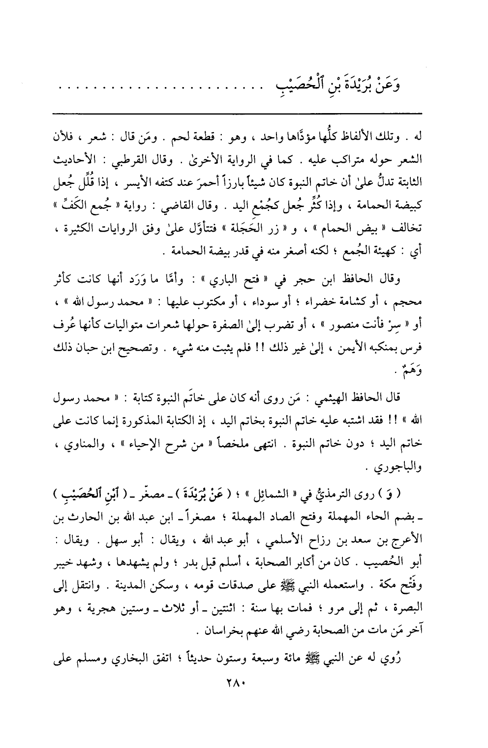 له. وتلك الألفاظ كلّها مؤدّاها واحد، وهو: قطعة لحم. ومن قال: شعر، فلأن الشعر حوله متراكب عليه. كما في الرواية الأخرى. وقال القرطبي: الأحاديث الثابتة تدلّ على أن خاتم النبوة كان شيئا بارزا أحمر عند كتفه الأيسر، إذا قلّل جعل كبيضة الحمامة، وإذا كثّر جعل كجمع اليد. وقال القاضي: رواية «جمع الكفّ» تخالف «بيض الحمام» ، و «زر الحجلة» فتتأوّل على وفق الروايات الكثيرة، أي: كهيئة الجمع؛ لكنه أصغر منه في قدر بيضة الحمامة.
