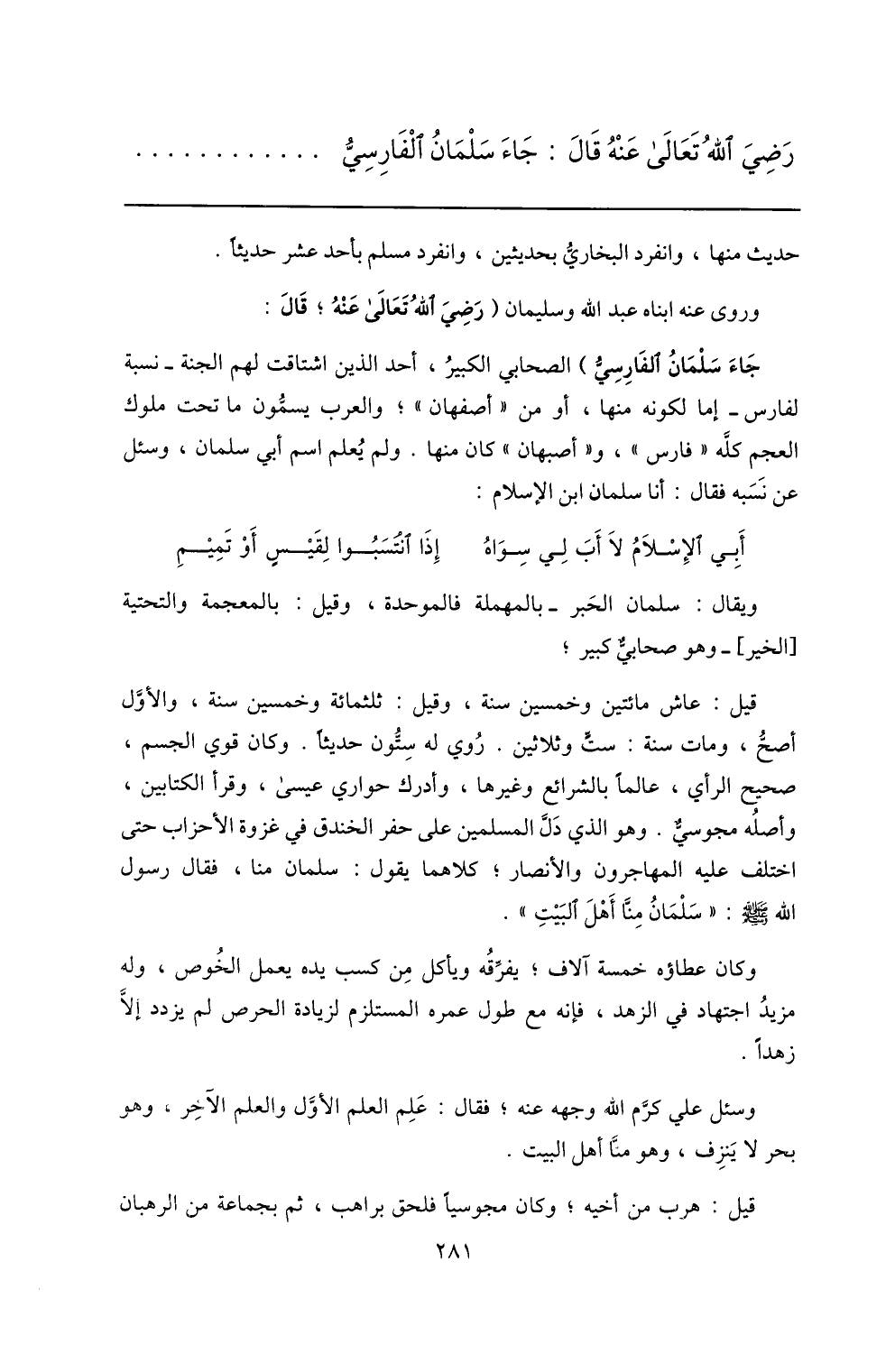 قيل: عاش مائتين وخمسين سنة، وقيل: ثلثمائة وخمسين سنة، والأوّل أصحّ، ومات سنة: ستّ وثلاثين. روي له ستّون حديثا. وكان قوي الجسم، صحيح الرأي، عالما بالشرائع وغيرها، وأدرك حواري عيسى، وقرأ الكتابين، وأصله مجوسيّ. وهو الذي دلّ المسلمين على حفر الخندق في غزوة الأحزاب حتى اختلف عليه المهاجرون والأنصار؛ كلاهما يقول: سلمان منا، فقال رسول الله صلّى الله عليه وسلم: «سلمان منّا أهل البيت» .