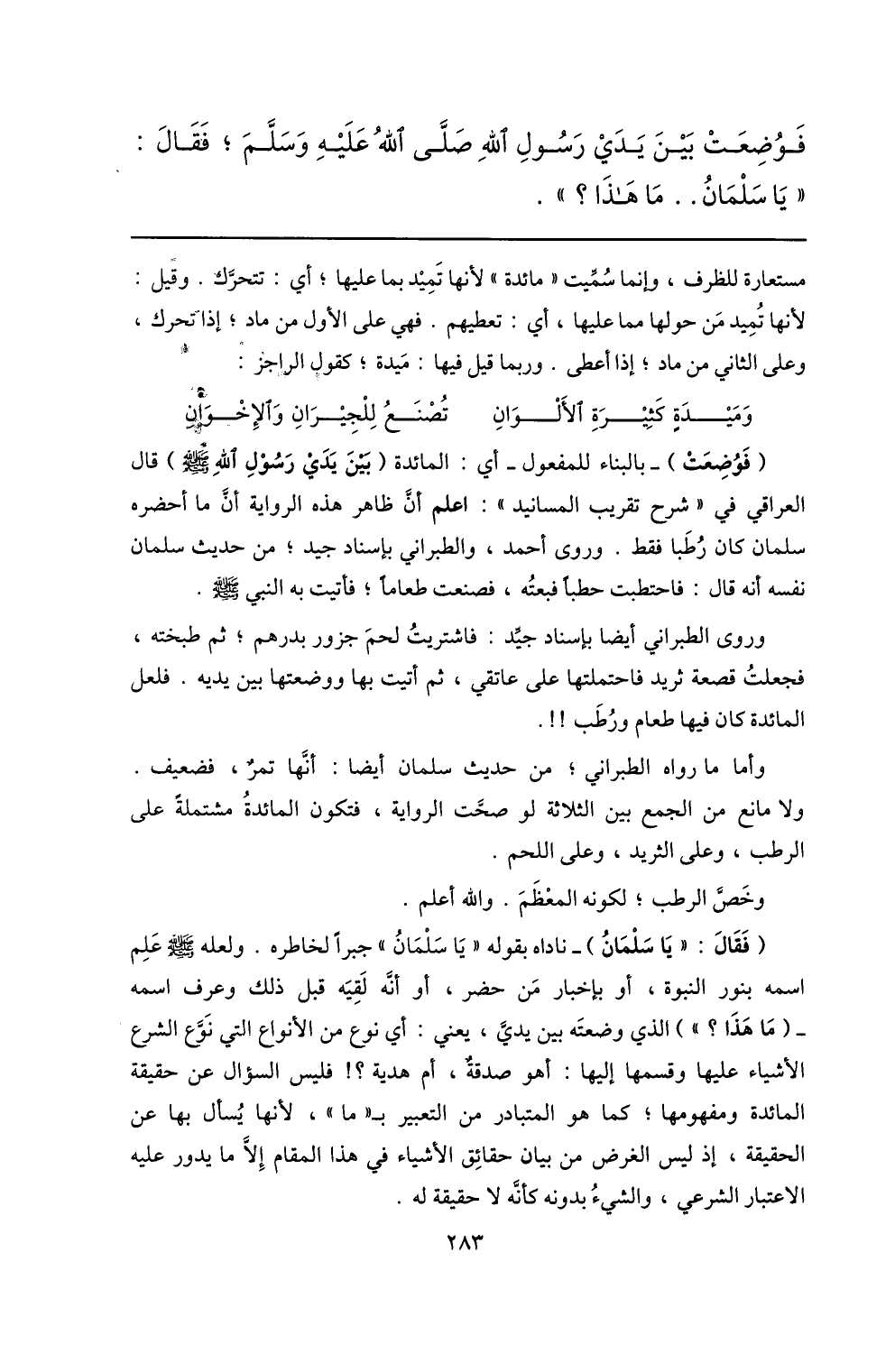 (فقال: «يا سلمان) - ناداه بقوله «يا سلمان» جبرا لخاطره. ولعله صلّى الله عليه وسلم علم اسمه بنور النبوة، أو بإخبار من حضر، أو أنّه لقيه قبل ذلك وعرف اسمه (ما هذا؟» ) الذي وضعته بين يديّ، يعني: أي نوع من الأنواع التي نوّع الشرع الأشياء عليها وقسمها إليها: أهو صدقة، أم هدية؟! فليس السؤال عن حقيقة المائدة ومفهومها؛ كما هو المتبادر من التعبير ب «ما» ، لأنها يسأل بها عن الحقيقة، إذ ليس الغرض من بيان حقائق الأشياء في هذا المقام إلّا ما يدور عليه الاعتبار الشرعي، والشيء بدونه كأنّه لا حقيقة له.