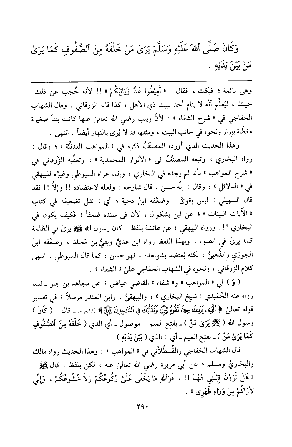 رواه البخاري، وتبعه المصنّف في «الأنوار المحمدية» ، وتعقّبه الزّرقاني في «شرح المواهب» بأنه لم يجده في البخاري، وإنما عزاه السيوطي وغيره للبيهقي في «الدلائل» ؛ وقال: إنّه حسن. قال شارحه: ولعله لاعتضاده!! وإلّا!! فقد قال السهيلي: ليس بقويّ. وضعّفه ابن دحية؛ أي: نقل تضعيفه في كتاب «الآيات البينات» ؛ عن ابن بشكوال، لأن في سنده ضعفا؛ فكيف يكون في البخاري!!. ورواه البيهقي؛ عن عائشة بلفظ: كان رسول الله صلّى الله عليه وسلم يرى في الظلمة كما يرى في الضوء. وبهذا اللفظ رواه ابن عديّ وبقيّ بن مخلد، وضعّفه ابن الجوزي والذّهبيّ، لكنه يعتضد بشواهده، فهو حسن؛ كما قال السيوطي. انتهى كلام الزرقاني، ونحوه في الشهاب الخفاجي على «الشفاء» .