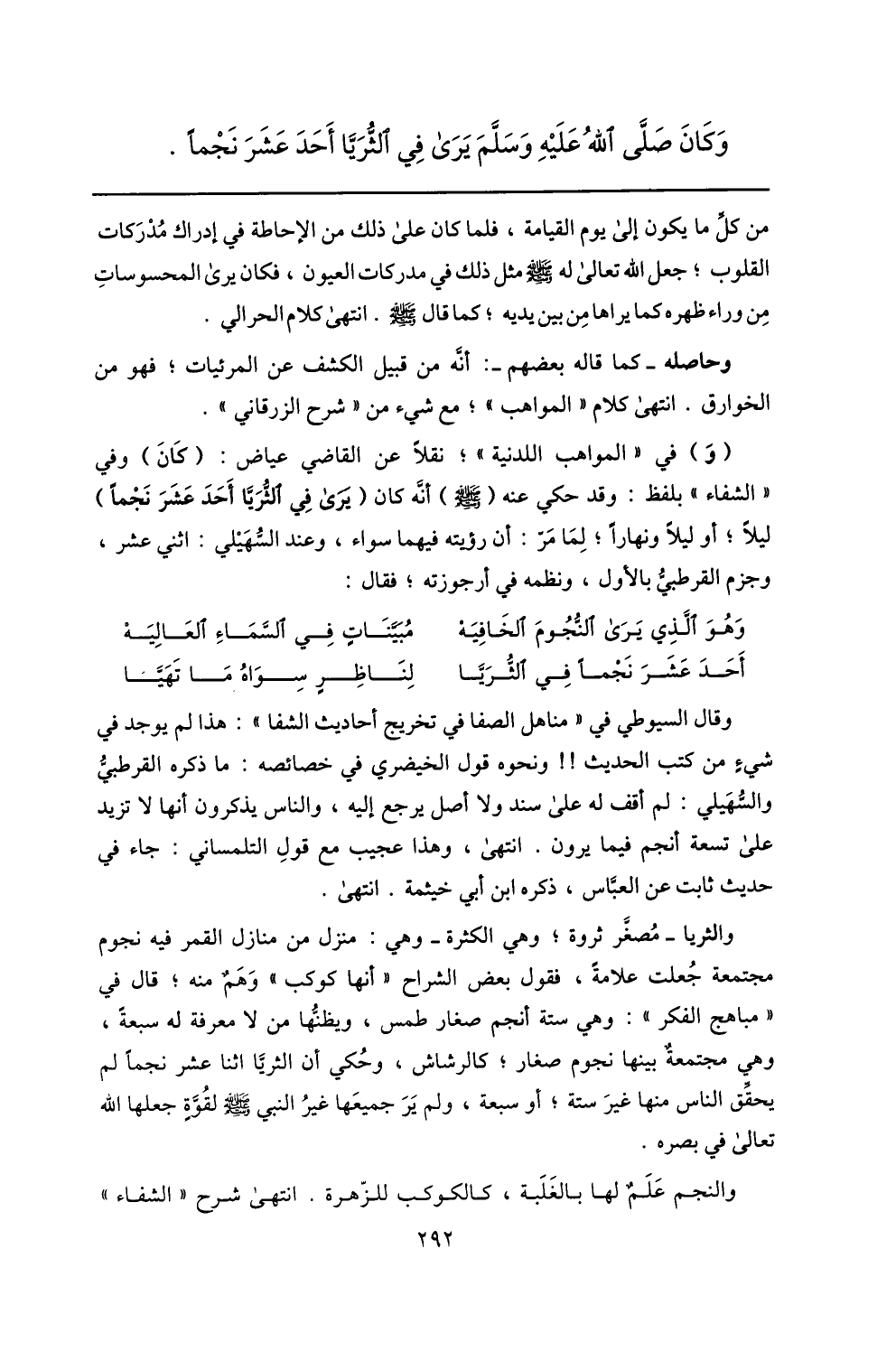 (و) في «المواهب اللدنية» ؛ نقلا عن القاضي عياض: (كان) وفي «الشفاء» بلفظ: وقد حكي عنه (صلّى الله عليه وسلم) أنّه كان (يرى في الثّريّا أحد عشر نجما) ليلا؛ أو ليلا ونهارا؛ لما مرّ: أن رؤيته فيهما سواء، وعند السّهيلي: اثني عشر، وجزم القرطبيّ بالأول، ونظمه في أرجوزته؛ فقال: