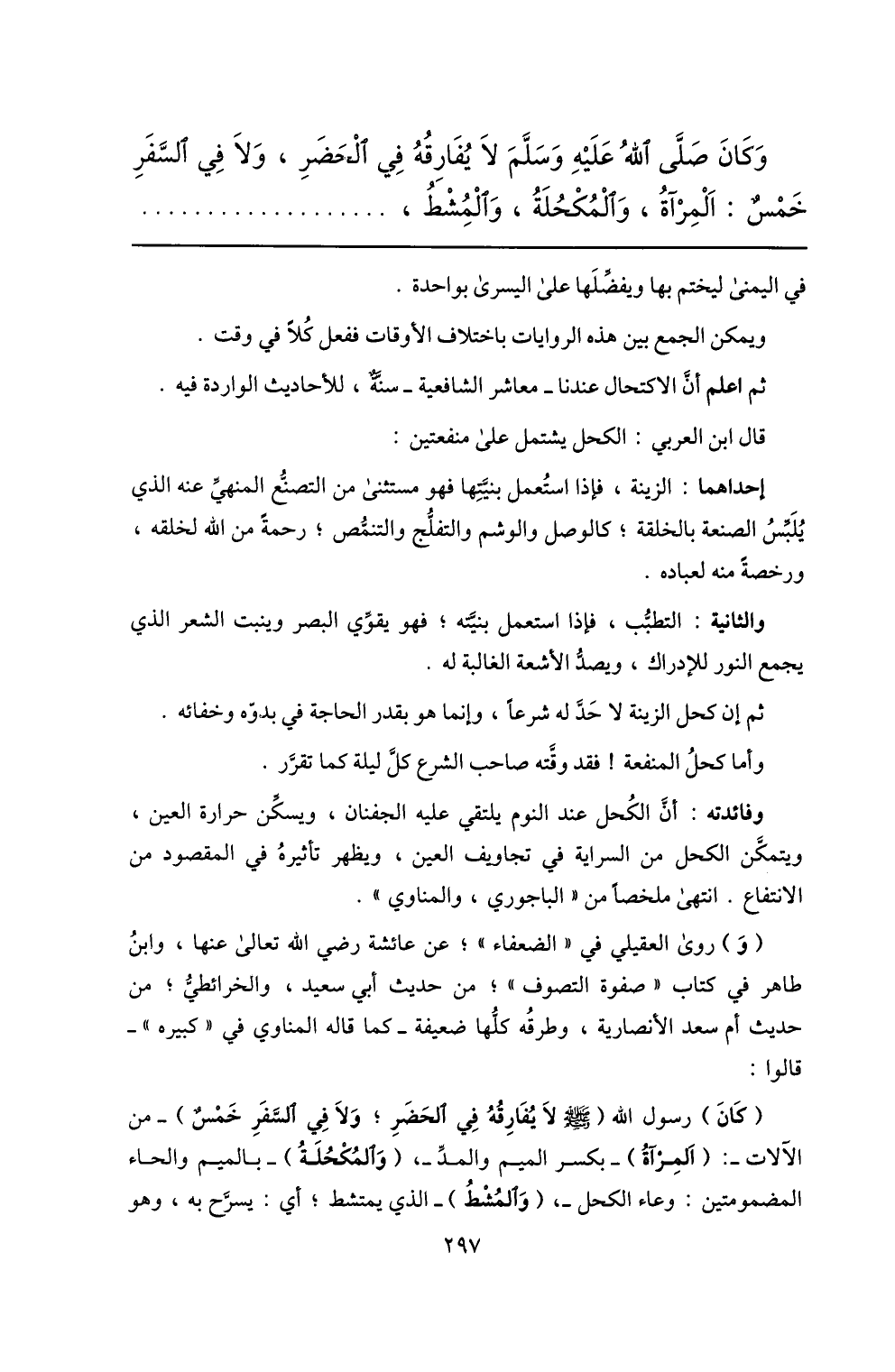 وكان صلّى الله عليه وسلّم لا يفارقه في الحضر، ولا في السّفر خمس: المرآة، والمكحلة، والمشط، ...