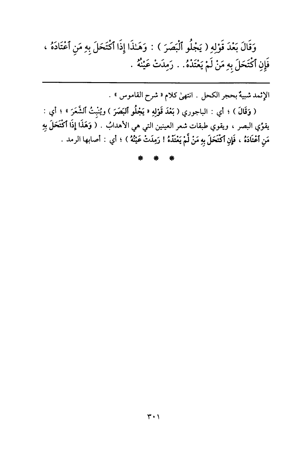 (وقال) ؛ أي: الباجوري (بعد قوله «يجلو البصر) وينبت الشّعر» ؛ أي: