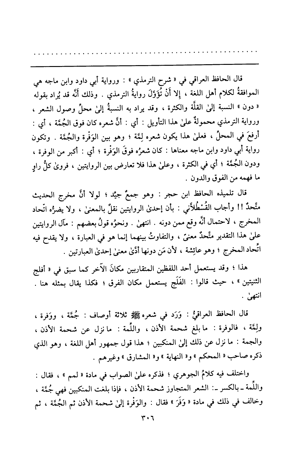 قال الحافظ العراقي في «شرح الترمذي» : ورواية أبي داود وابن ماجه هي الموافقة لكلام أهل اللغة، إلا أن تؤوّل رواية الترمذي. وذلك أنّه قد يراد بقوله «دون» النسبة إلى القلّة والكثرة، وقد يراد به النسبة إلى محلّ وصول الشعر، ورواية الترمذي محمولة على هذا التأويل: أي: أنّ شعره كان فوق الجمّة، أي: