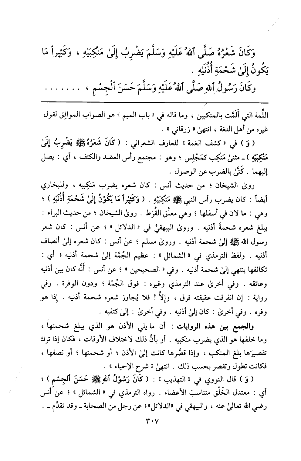 (و) في «كشف الغمة» للعارف الشعراني: (كان شعره صلّى الله عليه وسلم يضرب إلى منكبيه) - مثنى منكب كمجلس؛ وهو: مجتمع رأس العضد والكتف، أي: يصل إليهما. كنّى بالضرب عن الوصول.