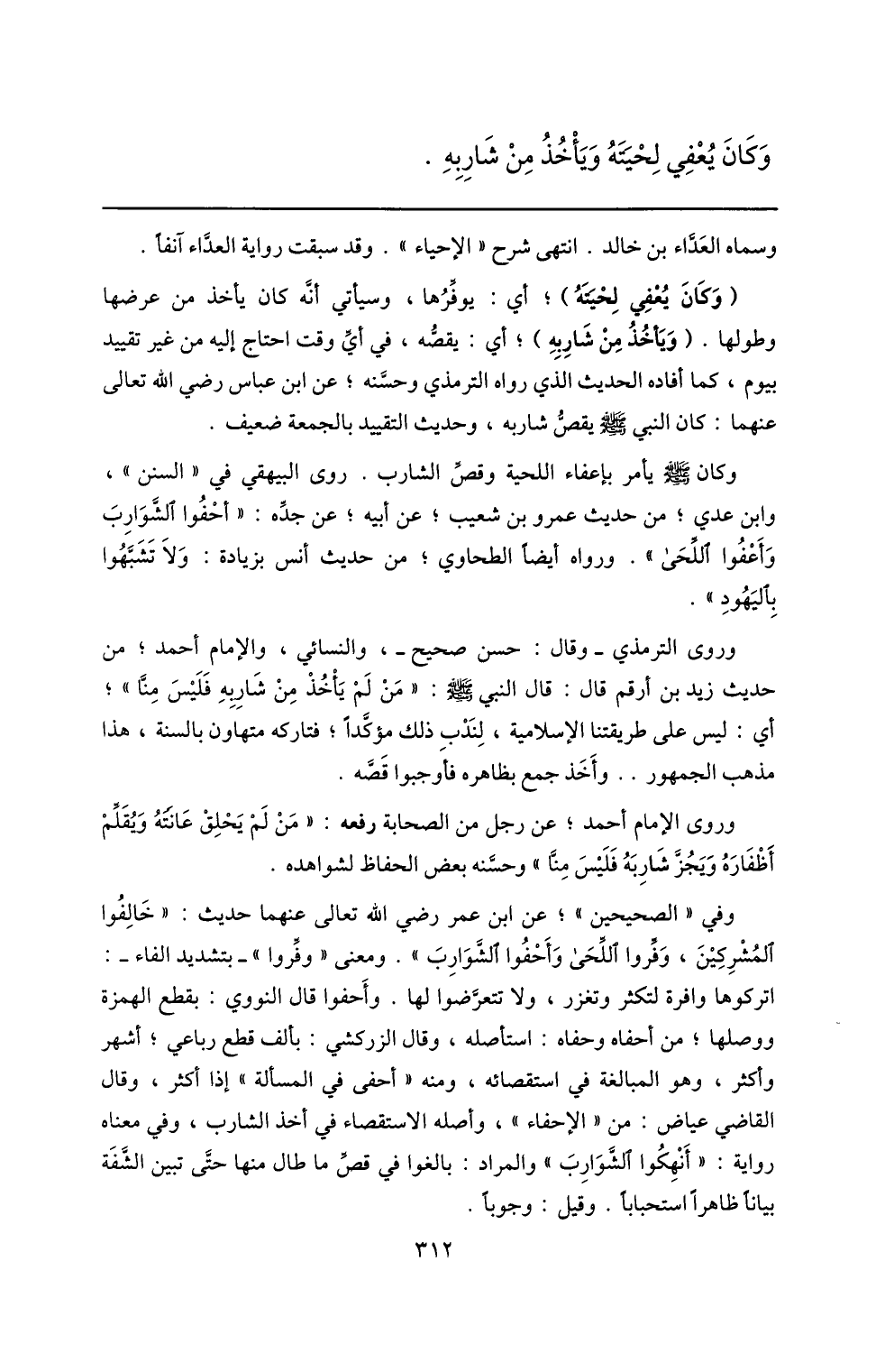 وروى الترمذي- وقال: حسن صحيح-، والنسائي، والإمام أحمد؛ من حديث زيد بن أرقم قال: قال النبي صلّى الله عليه وسلم: «من لم يأخذ من شاربه فليس منّا» ؛ أي: ليس على طريقتنا الإسلامية، لندب ذلك مؤكّدا؛ فتاركه متهاون بالسنة، هذا مذهب الجمهور.. وأخذ جمع بظاهره فأوجبوا قصّه.