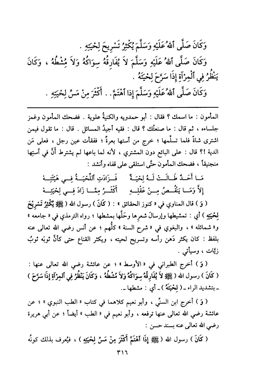 (و) قال المناوي في «كنوز الحقائق» : (كان) رسول الله (صلّى الله عليه وسلم يكثر تسريح لحيته) أي: تمشيطها وإرسال شعرها وحلّها بمشطها؛ رواه الترمذي في «جامعه» و «شمائله» ، والبغوي في «شرح السنة» كلّهم؛ عن أنس رضي الله تعالى عنه بلفظ: كان يكثر دهن رأسه وتسريح لحيته، ويكثر القناع حتى كأنّ ثوبه ثوب زيّات، وسيأتي.