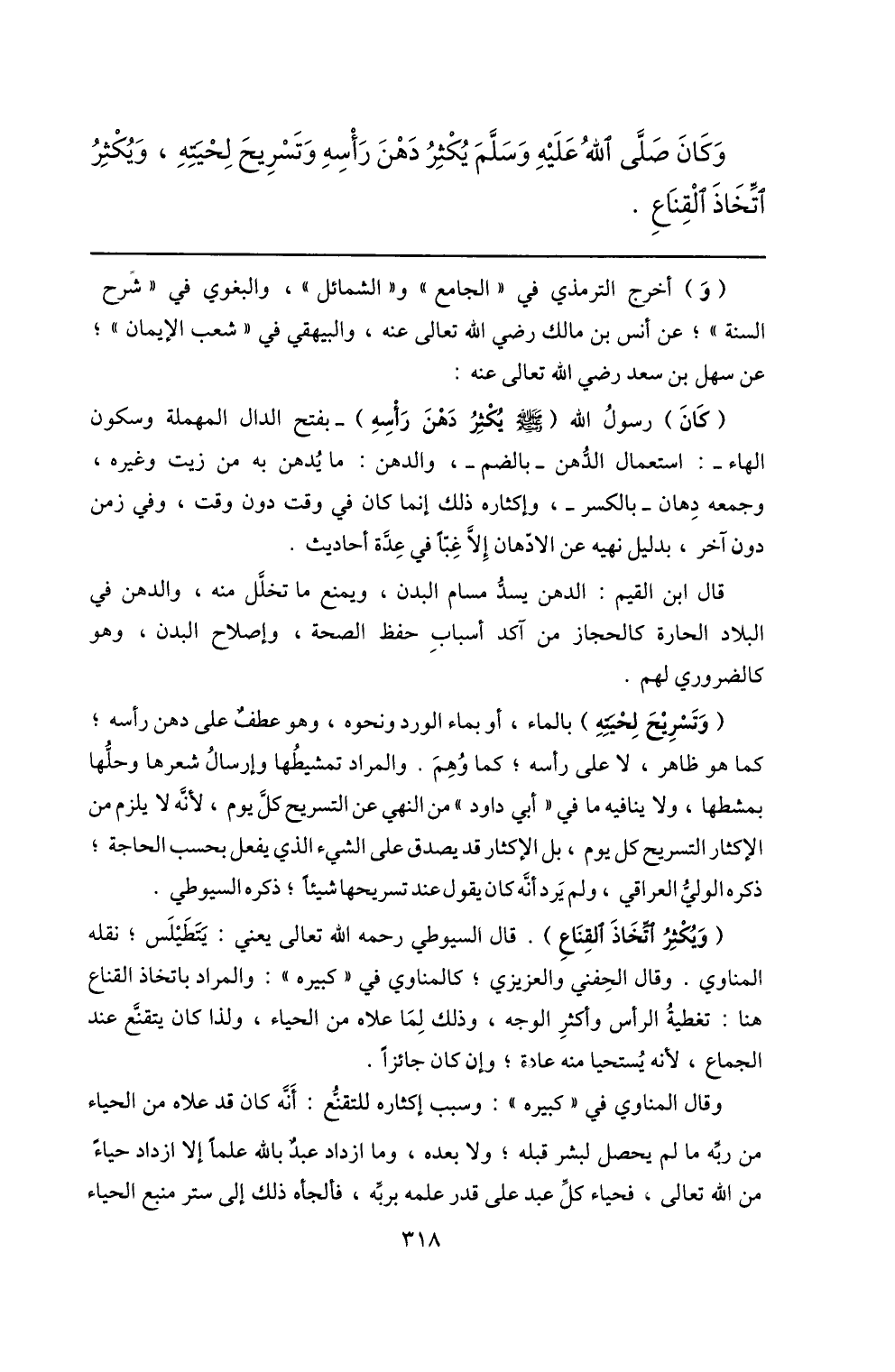 وكان صلّى الله عليه وسلّم يكثر دهن رأسه وتسريح لحيته، ويكثر اتّخاذ القناع.
