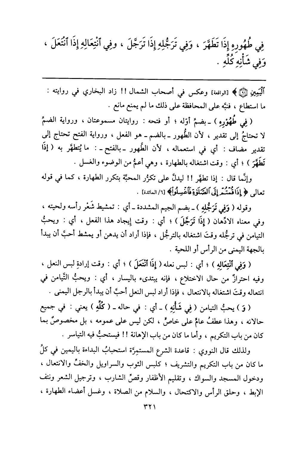 (و) يحبّ التيامن (في شأنه) - أي: في حاله- (كلّه) يعني: في جميع حالاته، وهذا عطف عامّ على خاصّ، لكن ليس على عمومه، بل مخصوص بما كان من باب التكريم، وأما ما كان من باب الإهانة!! فيستحبّ فيه التياسر.