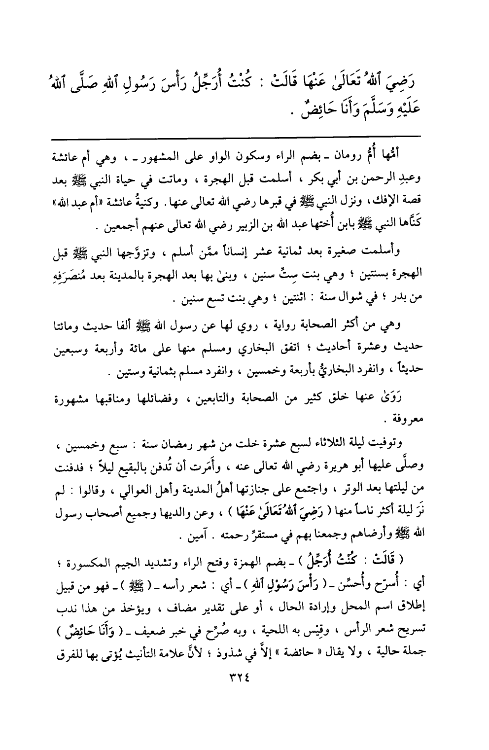 (قالت: كنت أرجّل) - بضم الهمزة وفتح الراء وتشديد الجيم المكسورة؛ أي: أسرّح وأحسّن- (رأس رسول الله) - أي: شعر رأسه- (صلّى الله عليه وسلم) - فهو من قبيل إطلاق اسم المحل وإرادة الحال، أو على تقدير مضاف، ويؤخذ من هذا ندب تسريح شعر الرأس، وقيس به اللحية، وبه صرّح في خبر ضعيف- (وأنا حائض) جملة حالية، ولا يقال «حائضة» إلّا في شذوذ؛ لأنّ علامة التأنيث يؤتى بها للفرق