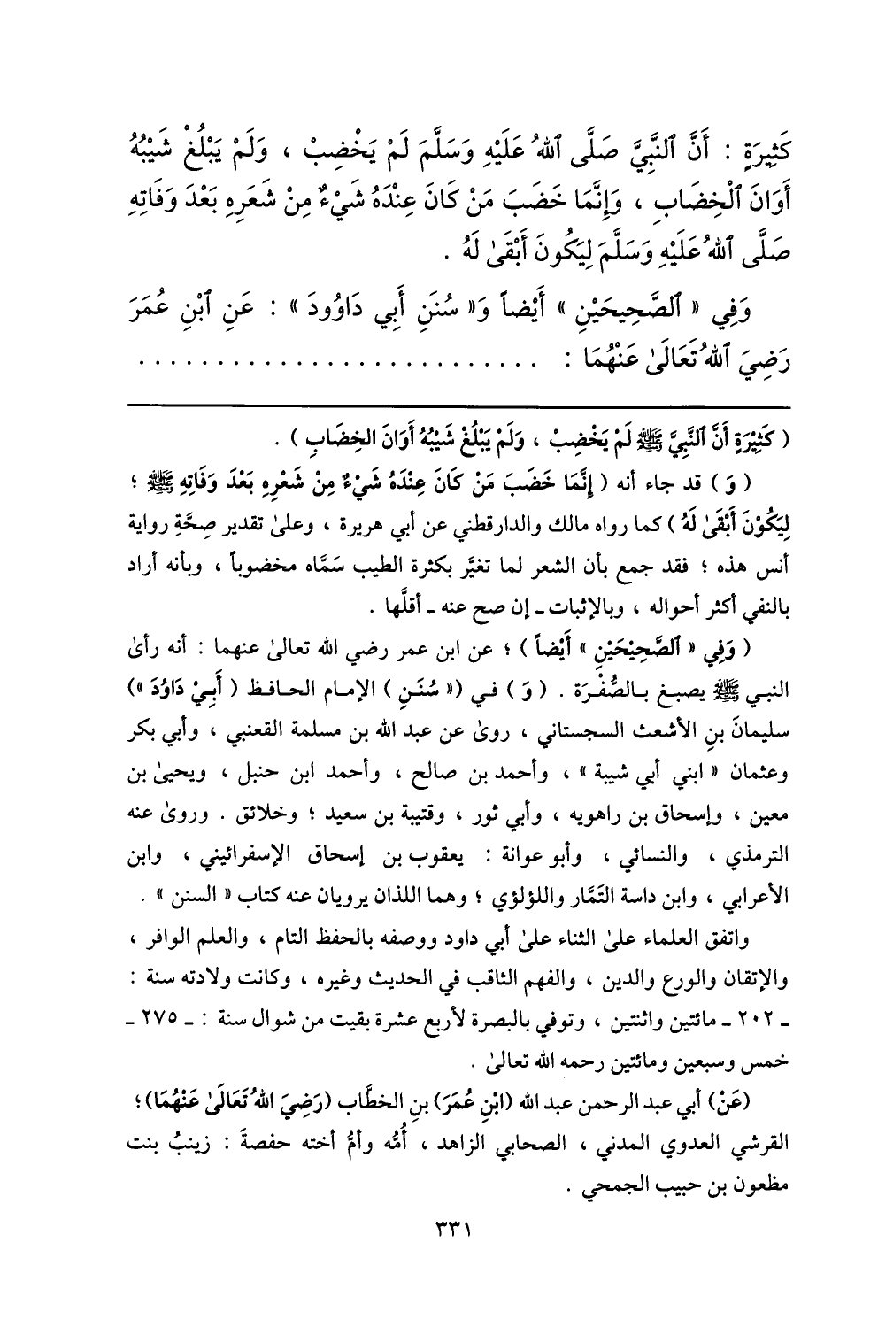 (وفي «الصّحيحين» أيضا) ؛ عن ابن عمر رضي الله تعالى عنهما: أنه رأى النبي صلّى الله عليه وسلم يصبغ بالصّفرة. (و) في ( «سنن) الإمام الحافظ (أبي داود» ) سليمان بن الأشعث السجستاني، روى عن عبد الله بن مسلمة القعنبي، وأبي بكر وعثمان «ابني أبي شيبة» ، وأحمد بن صالح، وأحمد ابن حنبل، ويحيى بن معين، وإسحاق بن راهويه، وأبي ثور، وقتيبة بن سعيد؛ وخلائق. وروى عنه الترمذي، والنسائي، وأبو عوانة: يعقوب بن إسحاق الإسفرائيني، وابن الأعرابي، وابن داسة التمّار واللؤلؤي؛ وهما اللذان يرويان عنه كتاب «السنن» .