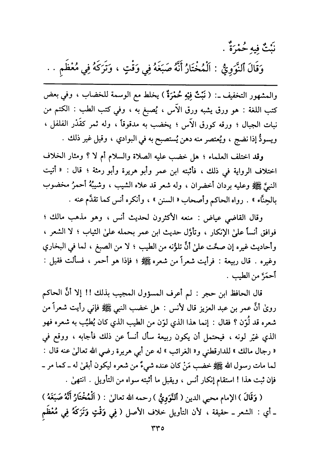 (وقال) الإمام محيي الدين (النّوويّ) رحمه الله تعالى: (المختار أنّه صبغه) أي: الشعر- حقيقة، لأن التأويل خلاف الأصل (في وقت وتركه في معظم