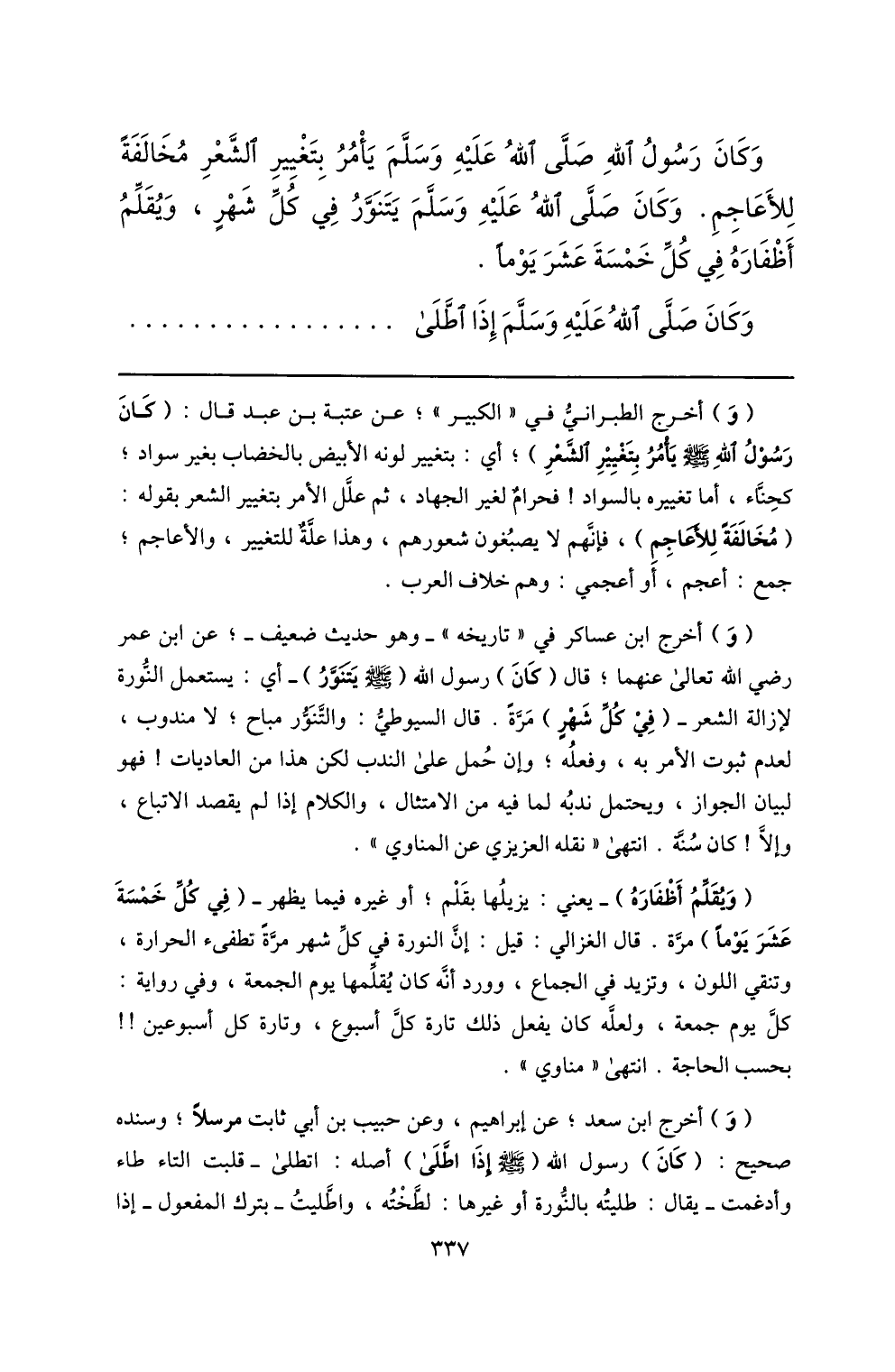 وكان رسول الله صلّى الله عليه وسلّم يأمر بتغيير الشّعر مخالفة للأعاجم. وكان صلّى الله عليه وسلّم يتنوّر في كلّ شهر، ويقلّم أظفاره في كلّ خمسة عشر يوما.