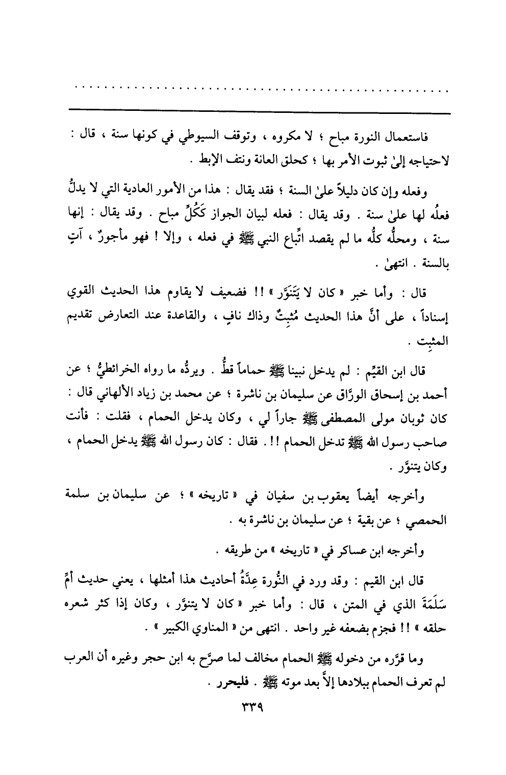 قال ابن القيّم: لم يدخل نبينا صلّى الله عليه وسلم حماما قطّ. ويردّه ما رواه الخرائطيّ؛ عن أحمد بن إسحاق الورّاق عن سليمان بن ناشرة؛ عن محمد بن زياد الألهاني قال: