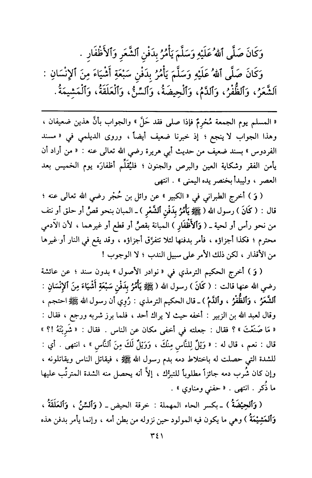 (و) أخرج الطبراني في «الكبير» عن وائل بن حجر رضي الله تعالى عنه؛ قال: (كان) رسول الله (صلّى الله عليه وسلم يأمر بدفن الشّعر) - المبان بنحو قصّ أو حلق أو نتف من نحو رأس أو لحية- (والأظفار) المبانة بقصّ أو قطع أو غيرهما، لأن الآدمي محترم؛ فكذا أجزاؤه، فأمر بدفنها لئلا تتفرّق أجزاؤه، وقد يقع في النار أو غيرها من الأقذار، لكن ذلك الأمر على سبيل الندب؛ لا الوجوب!
