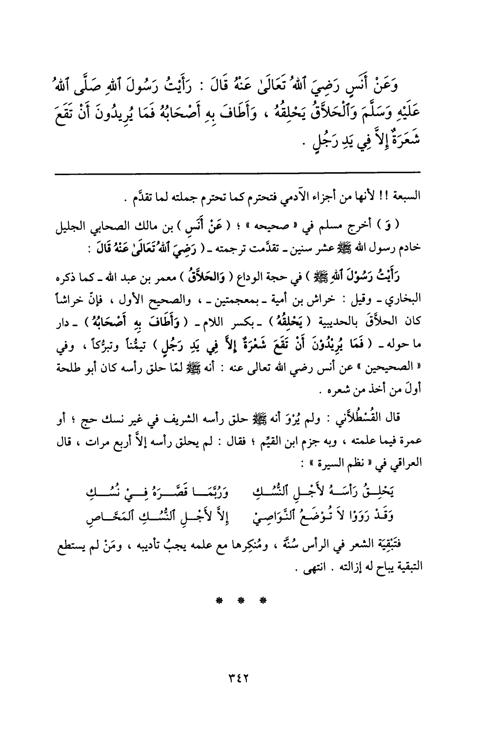 قال القسطلّاني: ولم يرو أنه صلّى الله عليه وسلم حلق رأسه الشريف في غير نسك حج؛ أو عمرة فيما علمته، وبه جزم ابن القيّم؛ فقال: لم يحلق رأسه إلّا أربع مرات، قال العراقي في «نظم السيرة» :
