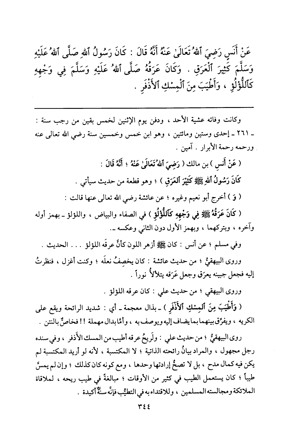 عن أنس رضي الله تعالى عنه أنّه قال: كان رسول الله صلّى الله عليه وسلّم كثير العرق. وكان عرقه صلّى الله عليه وسلّم في وجهه كاللّؤلؤ، وأطيب من المسك الأذفر.