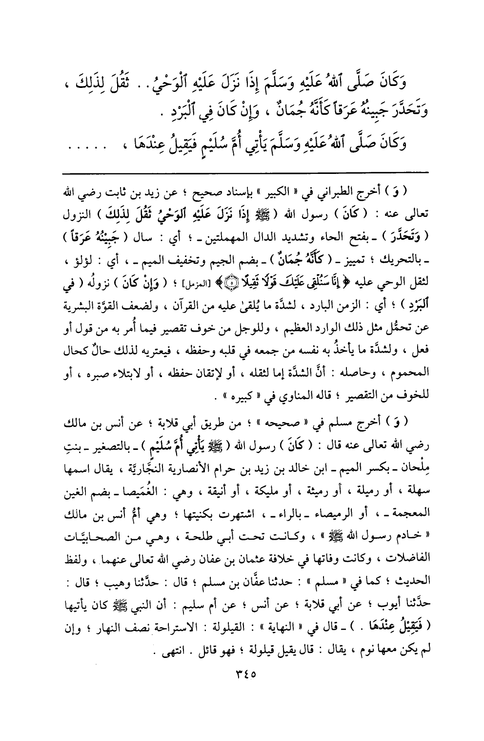 (و) أخرج الطبراني في «الكبير» بإسناد صحيح؛ عن زيد بن ثابت رضي الله تعالى عنه: (كان) رسول الله (صلّى الله عليه وسلم إذا نزل عليه الوحي ثقل لذلك) النزول (وتحدّر) - بفتح الحاء وتشديد الدال المهملتين-؛ أي: سال (جبينه عرقا) بالتحريك؛ تمييز- (كأنّه جمان) - بضم الجيم وتخفيف الميم-، أي: لؤلؤ، لثقل الوحي عليه (إِنَّا سَنُلْقِي عَلَيْكَ قَوْلًا ثَقِيلًا) (5) [المزمل] ؛ (وإن كان) نزوله (في البرد) ؛ أي: الزمن البارد، لشدّة ما يلقى عليه من القرآن، ولضعف القوّة البشرية عن تحمّل مثل ذلك الوارد العظيم، وللوجل من خوف تقصير فيما أمر به من قول أو فعل، ولشدّة ما يأخذ به نفسه من جمعه في قلبه وحفظه، فيعتريه لذلك حال كحال المحموم، وحاصله: أنّ الشدّة إما لثقله، أو لإتقان حفظه، أو لابتلاء صبره، أو للخوف من التقصير؛ قاله المناوي في «كبيره» .