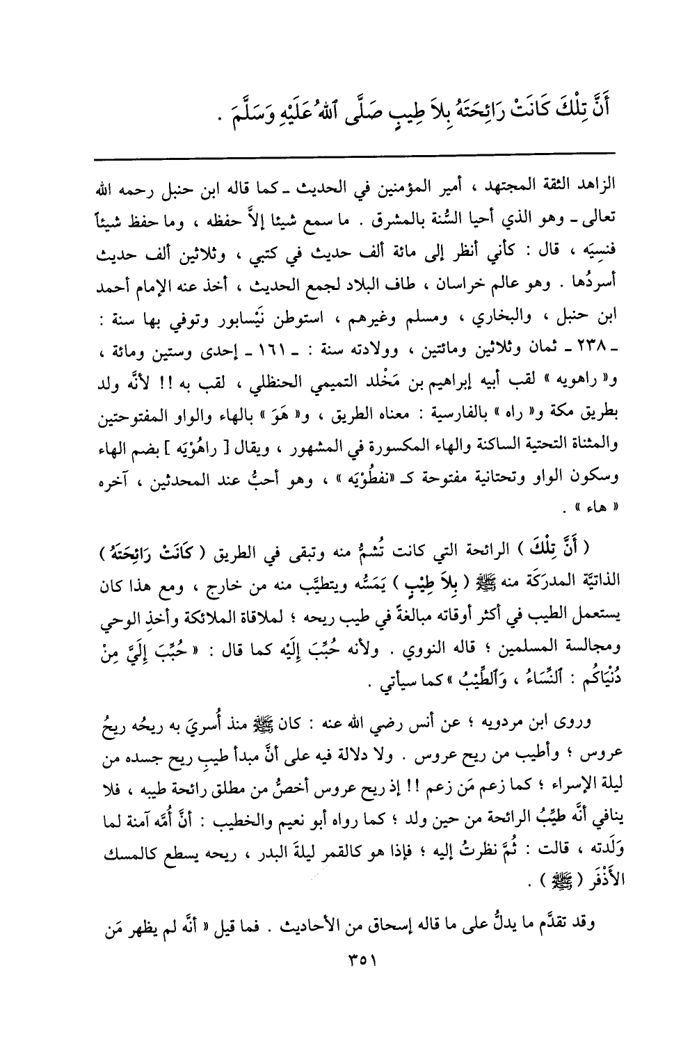 وروى ابن مردويه؛ عن أنس رضي الله عنه: كان صلّى الله عليه وسلم منذ أسري به ريحه ريح عروس؛ وأطيب من ريح عروس. ولا دلالة فيه على أنّ مبدأ طيب ريح جسده من ليلة الإسراء؛ كما زعم من زعم!! إذ ريح عروس أخصّ من مطلق رائحة طيبه، فلا ينافي أنّه طيّب الرائحة من حين ولد؛ كما رواه أبو نعيم والخطيب: أنّ أمّه آمنة لما ولدته، قالت: ثمّ نظرت إليه؛ فإذا هو كالقمر ليلة البدر، ريحه يسطع كالمسك الأذفر (صلّى الله عليه وسلم) .