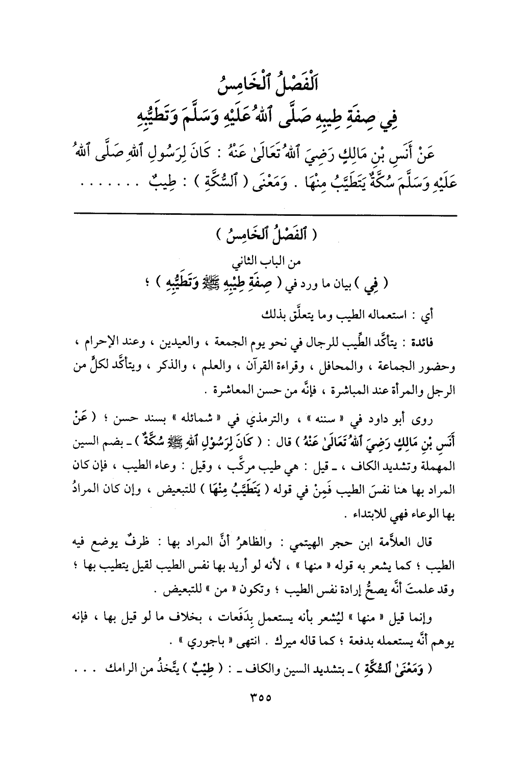 الفصل الخامس في صفة طيبه صلّى الله عليه وسلّم وتطيّبه عن أنس بن مالك رضي الله تعالى عنه: كان لرسول الله صلّى الله عليه وسلّم سكّة يتطيّب منها. ومعنى (السّكّة) : طيب ...